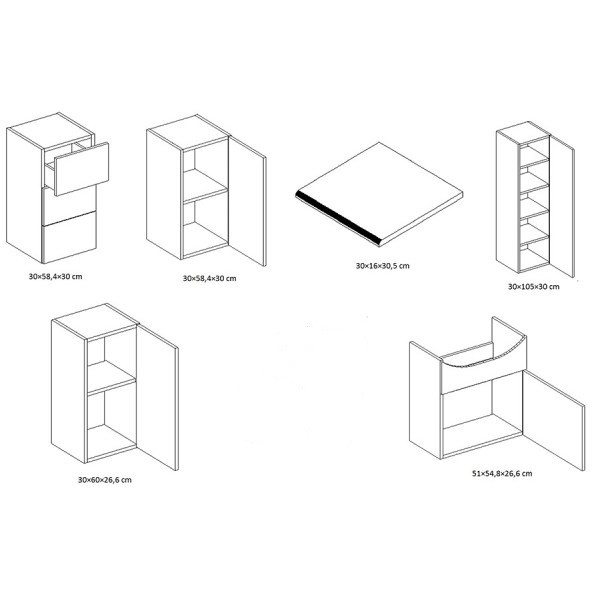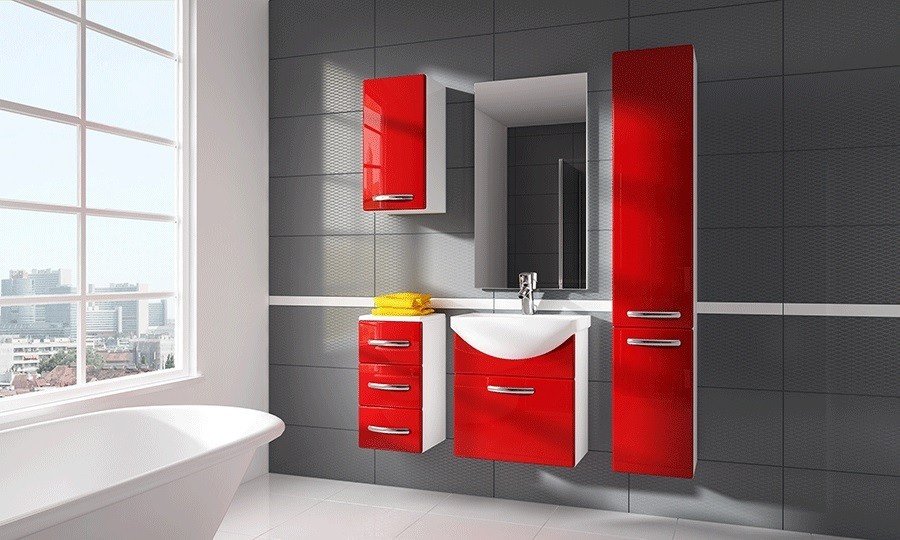 Kopalniški blok KORAL v rdeči barvi bo vašo kopalnico preobrazil v sodoben in moderen prostor. Prav poseben vtis bodo naredile zaobljene linije. Sestavljen je iz več kopalniških elementov, ki nudijo veliko prostora. Namenjen je vsem tistim, ki si želite veliko prostora za shranjevanje. Primeren je za shranjevanje kozmetike, brisač in drugih izdelkov. Moderen kopalniški blok je narejen iz visoko kvalitetne plošče MDF in oplemenitene iverne plošče. Fronte (vrata omaric) so narejene iz lakirane MDF plošče (16 mm), stranice omaric pa so narejene iz oplemenitene iverne plošče (16 mm). Ročaji so kovinski.