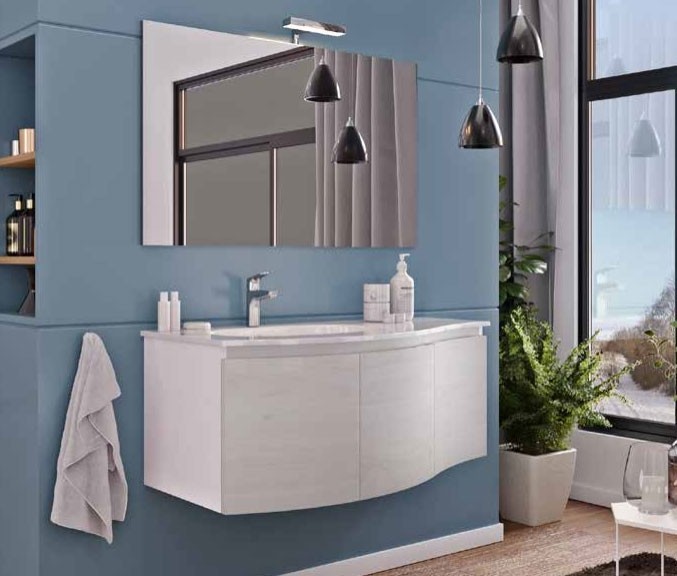 Kopalniški blok ONDA s svojo kombinaciji nordijskega lesa in bele barve visokega sijaja v prostor prinaša pridih skandinavskega pohištva, ki daje prostoru mirnost in eleganco. Kopalniški blok vsebuje umivalno korito, visečo omarico in pa ogledalo. Vsebuje tudi LED osvetlitev.