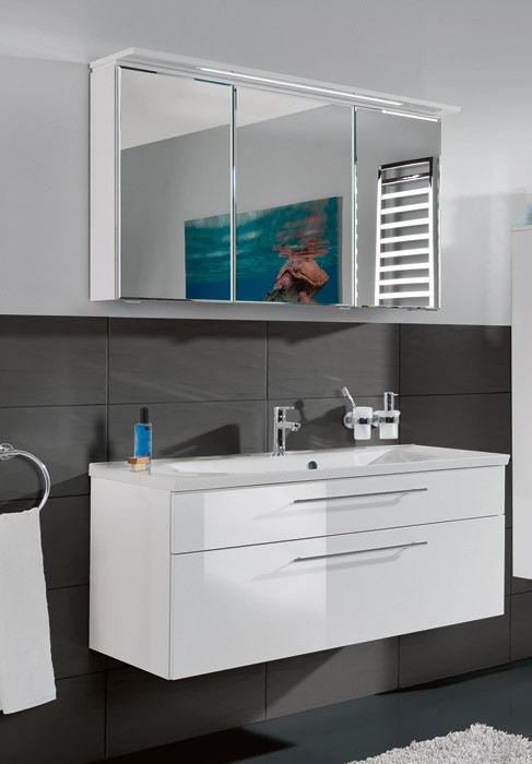 Kopalniški blok Wow je na voljo v beli barvi, visokega sijaja. Kopalniški blok je sestavljen iz omarice z ogledalom, omarice za umivalnik in umivalnika iz mineralne litine. Sestav vsebuje tudi LED osvetlitev.
