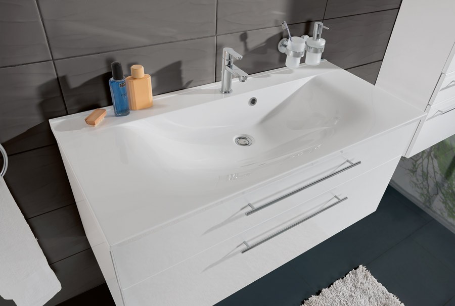 - Pri umivalnikih s pritrdilnimi vijaki je treba mere za vrtanje vrisati na kraju uporabe, po namestitvi umivalnika na omarico za pod umivalnik. Pritrdilne vijake morate privijačiti! Umivalniki brez pritrdilnih konzol se pritrdijo na steno in na strani pohištva s silikonom.