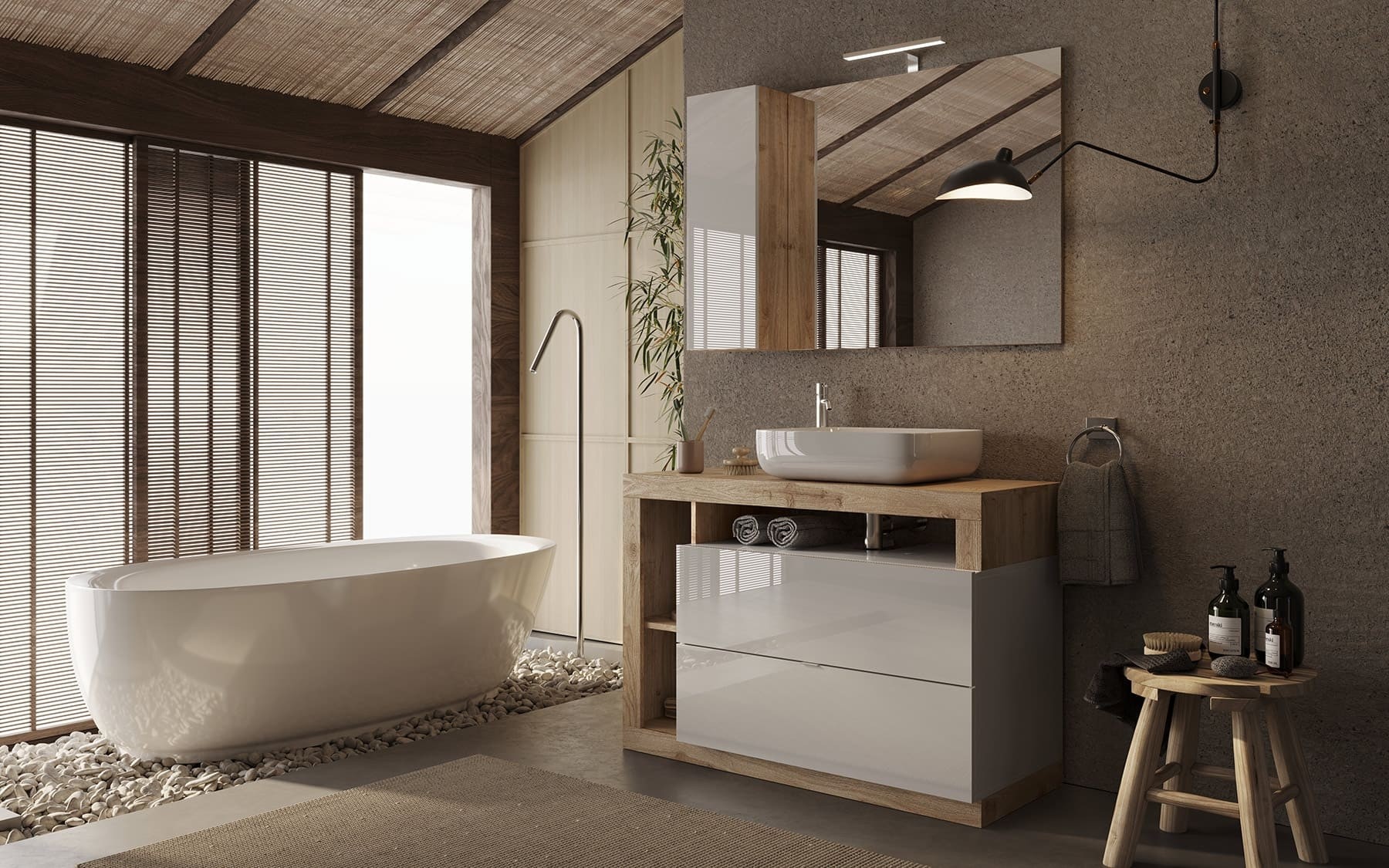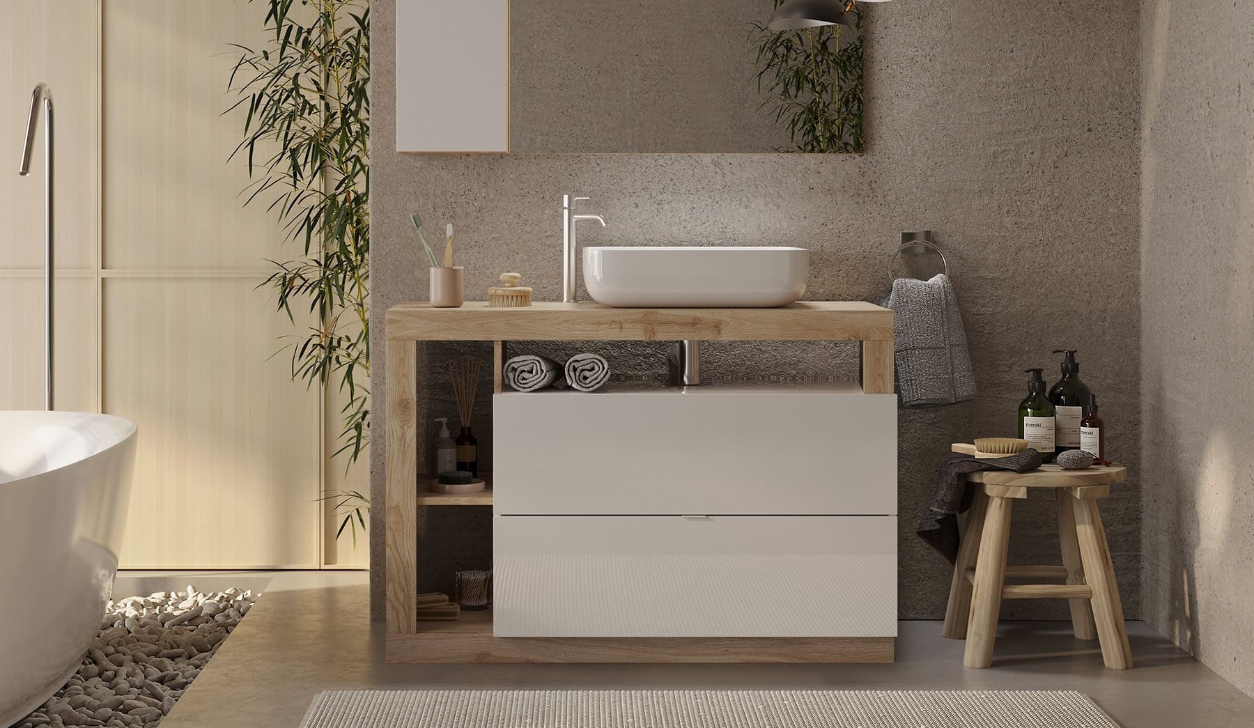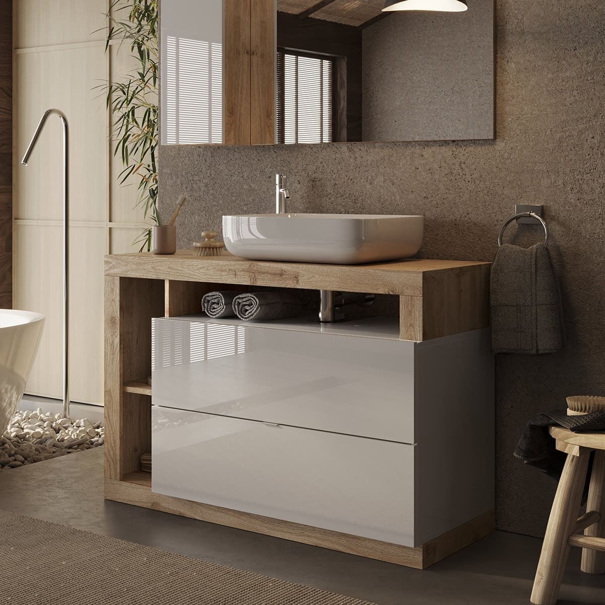 Ta kopalniški blok brez ogledala vključuje dva prostorna predala, ki omogočata enostavno shranjevanje vseh vaših kopalniških potrebščin. Njegov eleganten videz v beli barvi z visokim sijajem in kontrastnim hrastovim dekorjem poskrbi za topel in moderen videz prostora.
