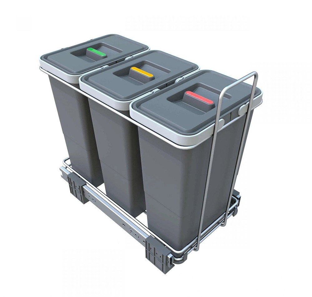 Odkrijte praktično rešitev za razvrščanje odpadkov z našim vgradnim košem ECOFIL za smeti, ki se ponaša s tremi ločenimi posodami. Ta koš je idealen za organizirano in higiensko ločevanje odpadkov neposredno v vaši kuhinji. Zasnovan je za montažo na dno omarice z vrati, zagotavlja enostaven dostop z ročnim izvlečnim mehanizmom.