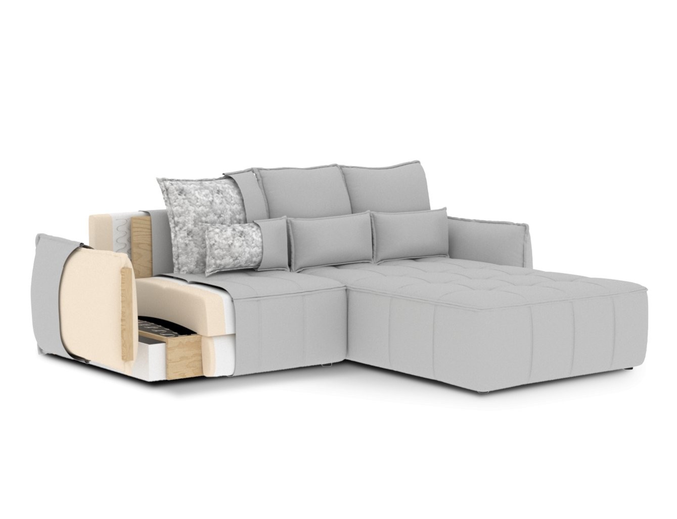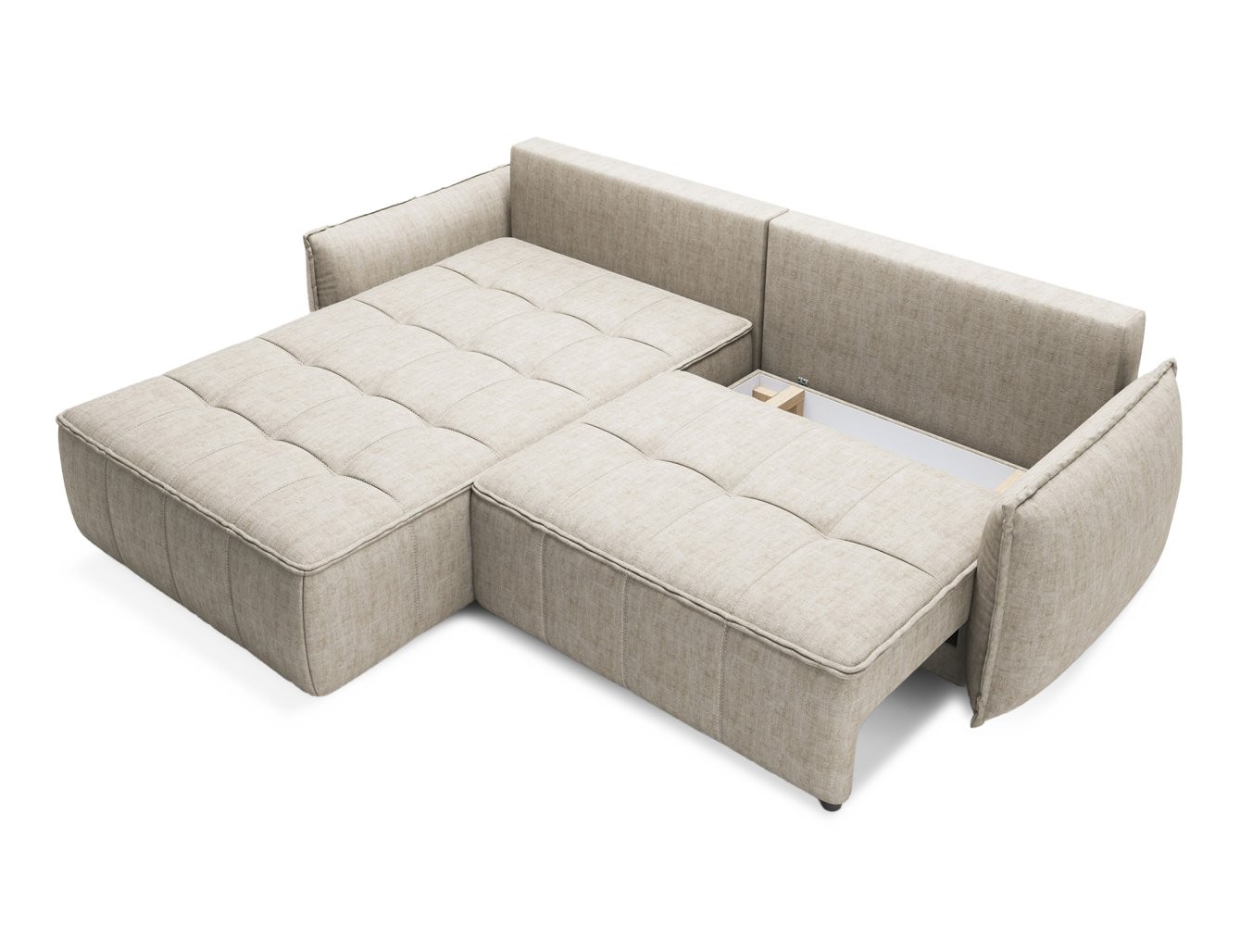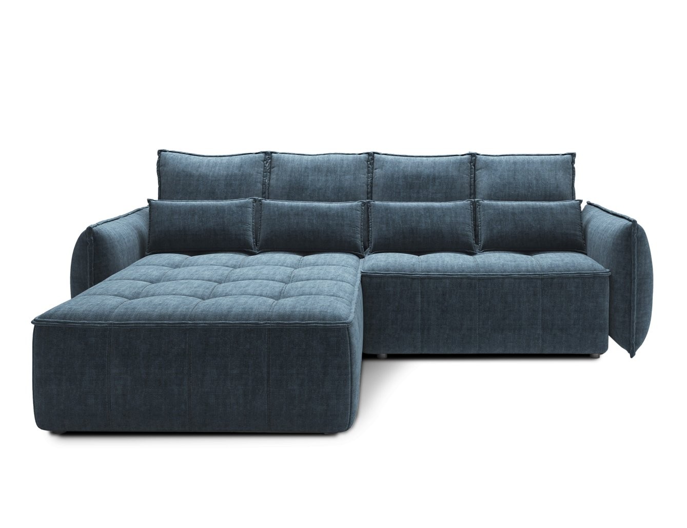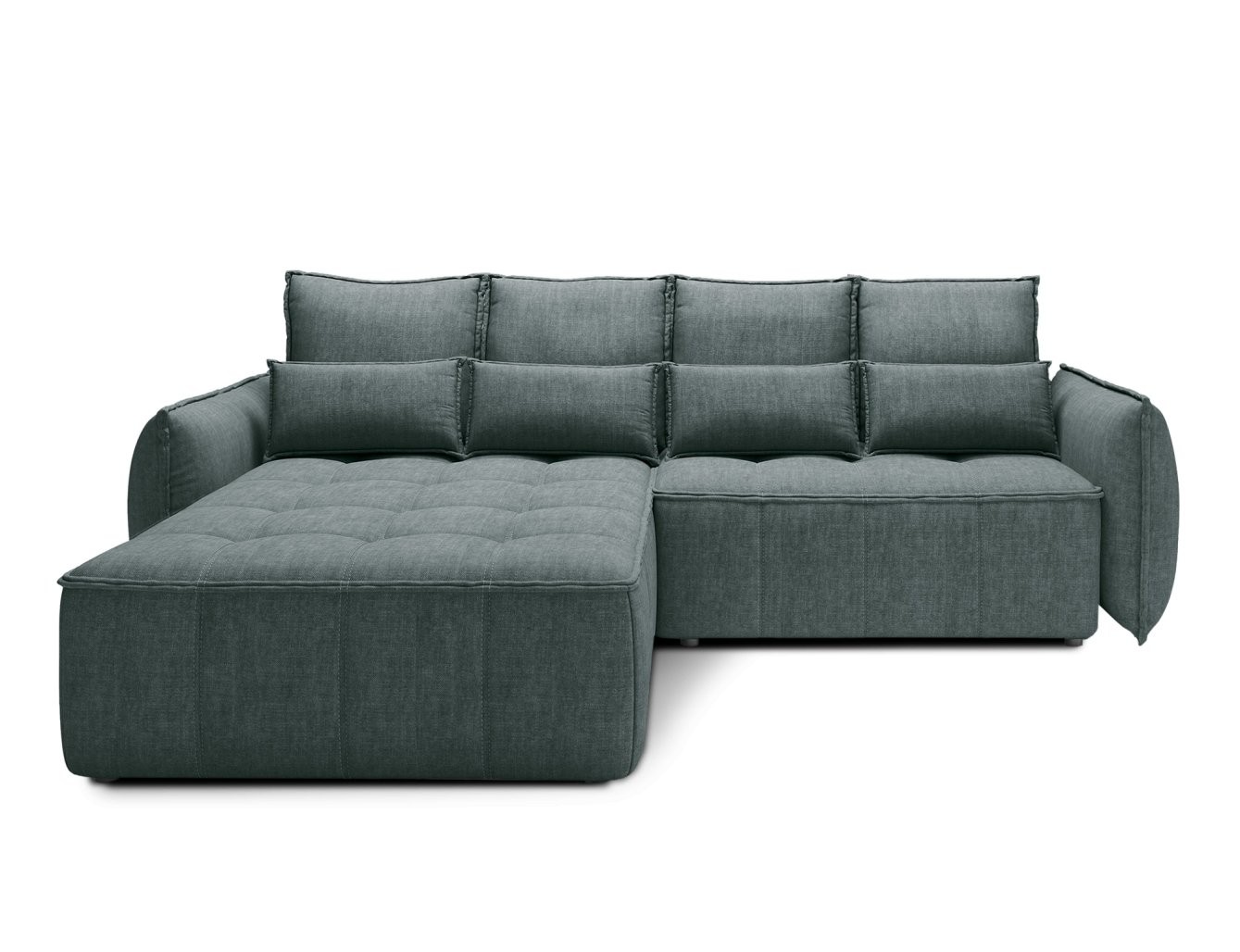 Garnitura je opremljena s štirimi naslonskimi in štirimi ledvenimi blazinami, ki zagotavljajo optimalno oporo in udobje. Vgrajen predal za shranjevanje (97x60x15 cm) omogoča praktično shranjevanje posteljnine ali drugih predmetov, kar pripomore k urejenemu videzu prostora.