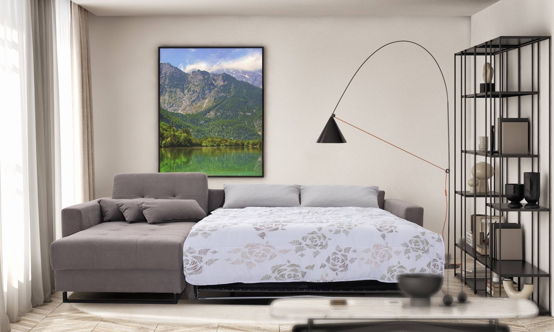 Posebnost garniture je mehanizem izvlečnega ležišča s trojnim preklopom, ki omogoča hitro in enostavno pretvorbo v prostorno ležišče dimenzij 190 x 140 x 12 cm. Rotirajoč naslon omogoča še večjo prilagodljivost pri uporabi ležišča.