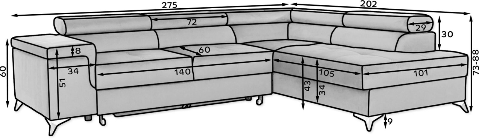 Kotna sedežna garnitura Eridano združuje udobje, eleganco in funkcionalnost v enem izjemnem kosu pohištva. S svojo L-obliko in modernim dizajnom bo postala središče vsake dnevne sobe, hkrati pa zagotavlja vrhunsko izkušnjo sprostitve in spanja.