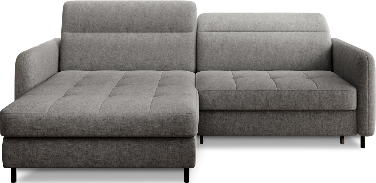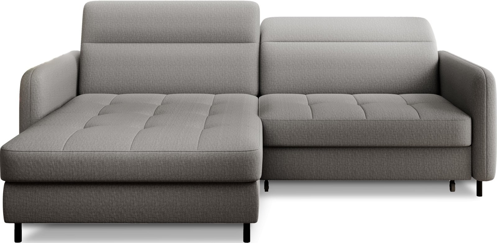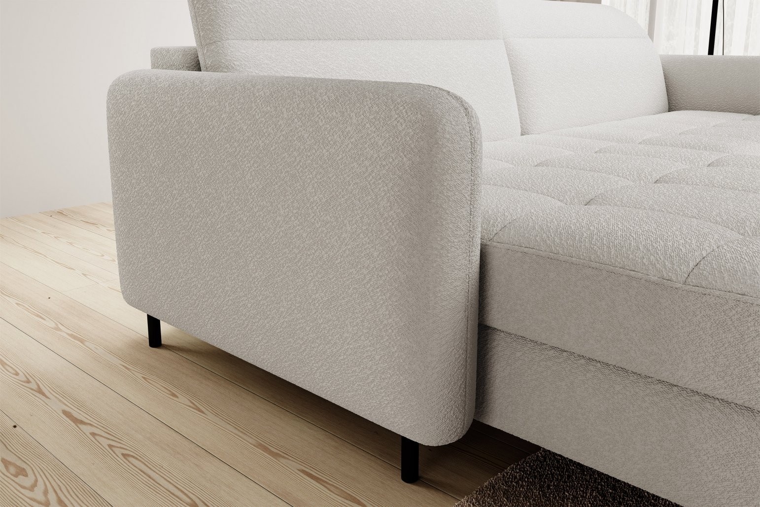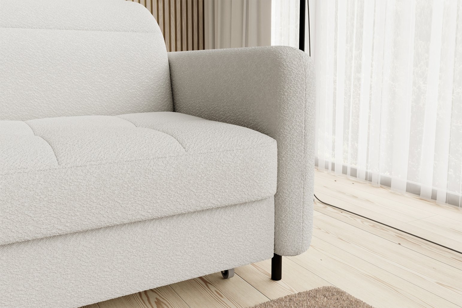 Oblazinjeno hrbtišče omogoča postavitev kjerkoli v prostoru, medtem ko črne kovinske noge in prešiti sedeži dodajo pridih prefinjenosti. Garnitura je opremljena s funkcijo spanja, ki ponuja ležišče velikosti 128x200 cm – popolno za sprostitev ob gledanju priljubljenih filmov ali kot dodatno ležišče za goste.