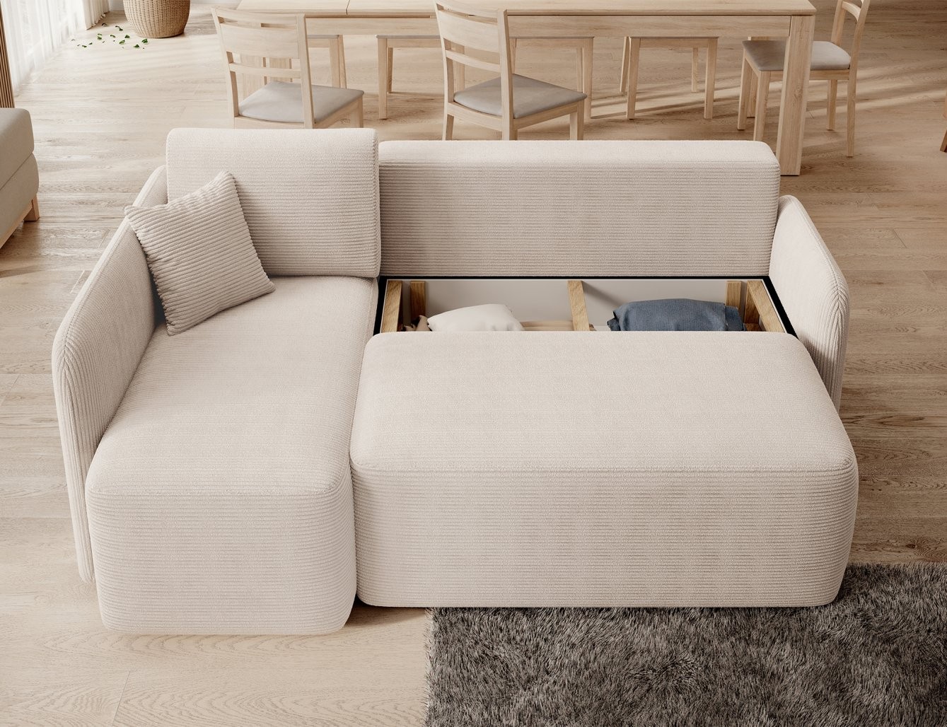 Kotna sedežna garnitura Hadson je elegantna in sodobna izbira za vsak dom. S svojo premišljeno obliko in funkcionalnostjo prinaša udobje in stil v vsak prostor. Idealna je za sprostitev celotne družine, hkrati pa ponuja tudi možnost prenočevanja za goste.