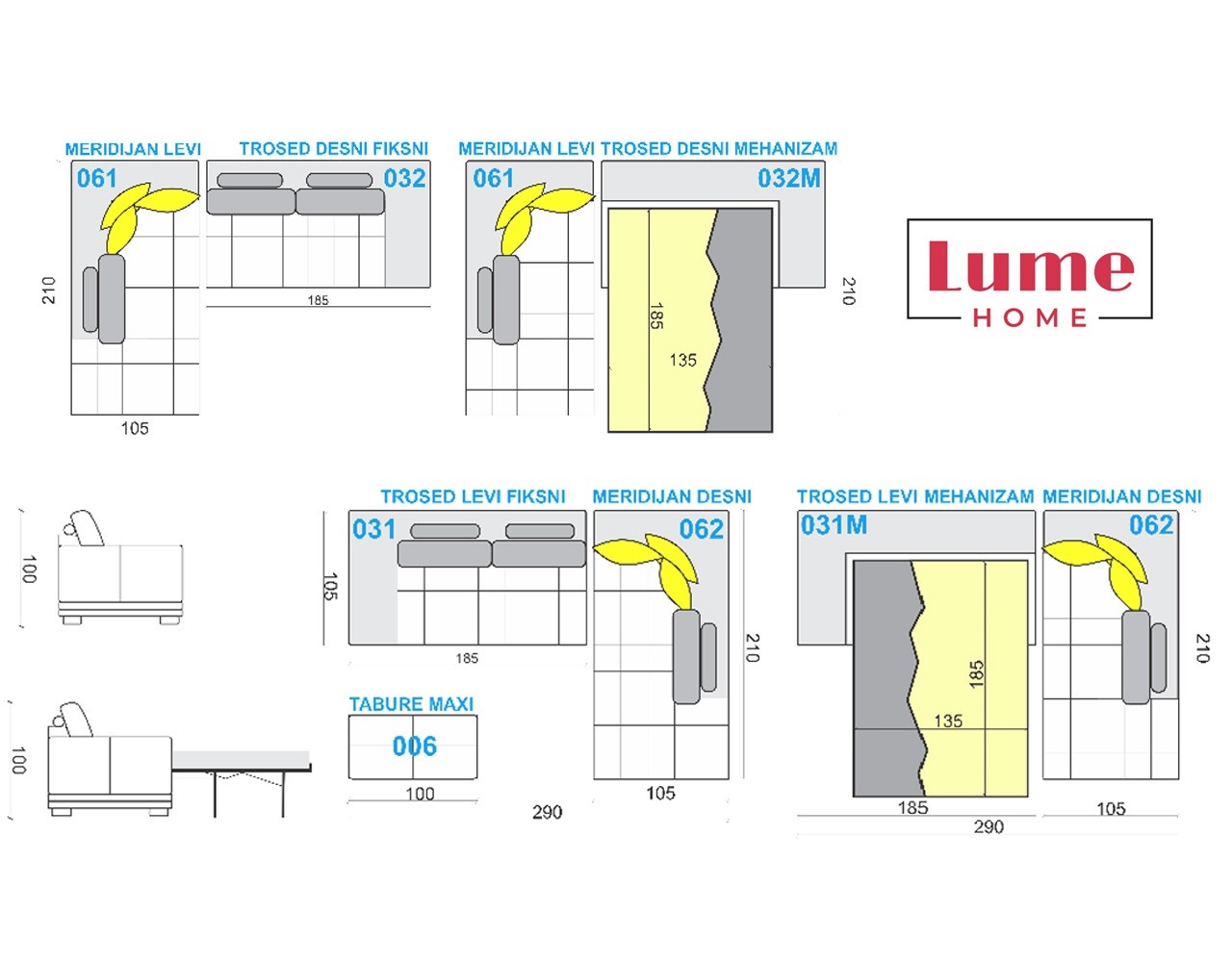 Poleg materialov in barv pa si lahko izberete tudi različno postavitev sedežne. Za kombiniranje so na voljo trosedi v levi ali desni različici z mehanizmom ali brez, ki jih lahko prilagodite svojim željam in potrebam.