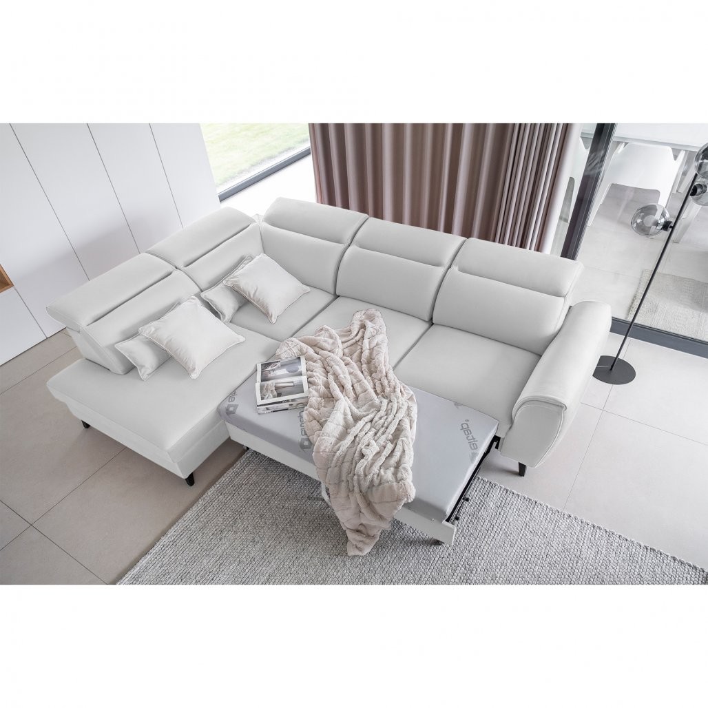 Ta prostorna garnitura z dimenzijami 265 x 201 x 100 cm ponuja dovolj prostora za sprostitev celotne družine ali gostov. Poleg tega omogoča tudi udobno prenočevanje, saj se preprosto raztegne v ležišče velikosti 120 x 195 cm s pomočjo zanesljivega mehanizma tipa 'delfin'.