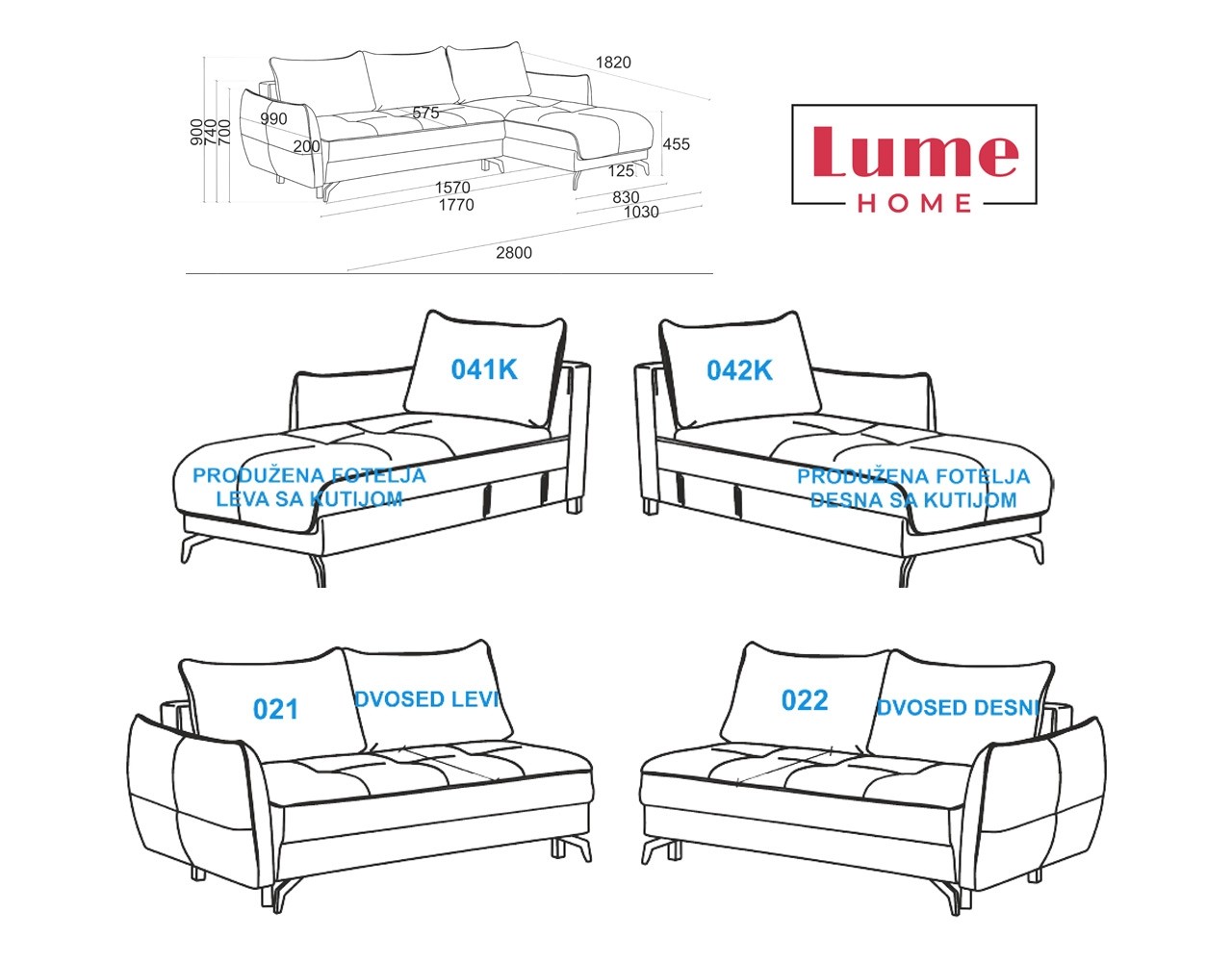 Sedežna garnitura Primadona je izdelana v Evropi in ponuja najboljše razmerje med ceno in kakovostjo, kar je zaščitni znak blagovne znamke Lume Home. Z uporabo vrhunskih materialov in skrbno načrtovane izdelave je garnitura zasnovana tako, da zdrži leta uporabe, ne da bi pri tem izgubila na udobju ali vizualni privlačnosti.