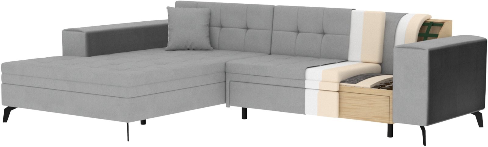 Ta prostorna garnitura nudi dovolj prostora za sprostitev čez dan in prijetno spanje ponoči, saj vključuje funkcijo ležišča z dimenzijami 210 x 126 cm in enostavnim raztegljivim mehanizmom dolphin.