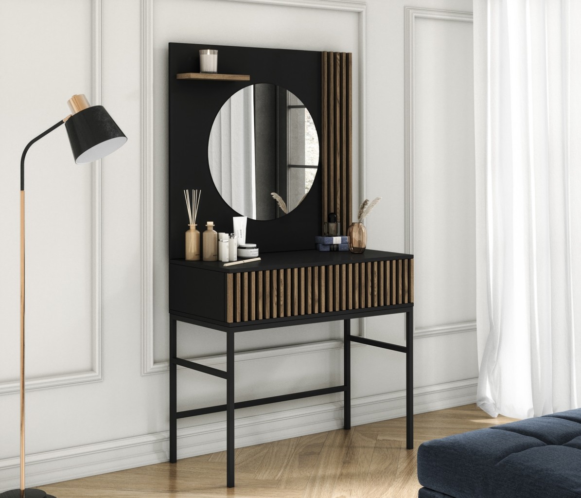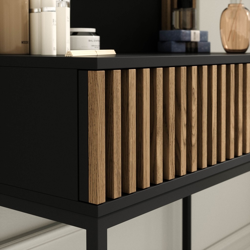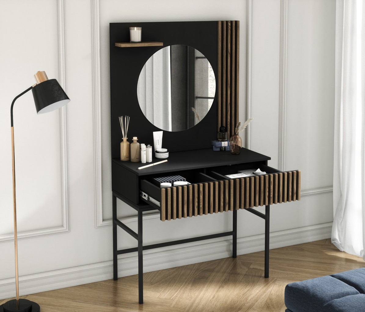 Črna kozmetična mizica MEORATI je eleganten dodatek za vašo spalnico. Kozmetična mizica ima dva predala z rezkanimi frontami v barvi hrasta, kar ji doda edinstven značaj. Ti predali so praktični in pomagajo ohranjati vaše stvari urejene in organizirane.