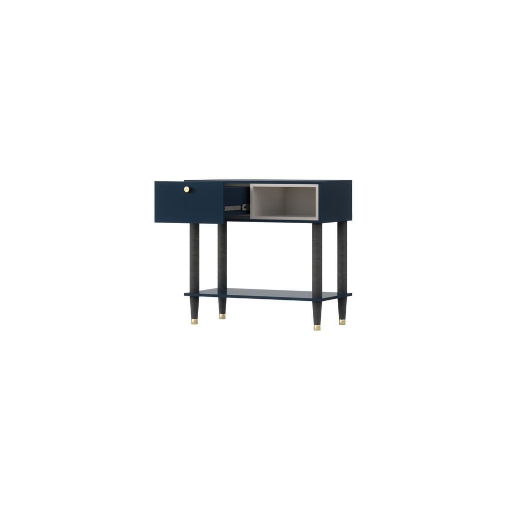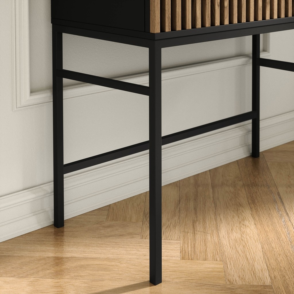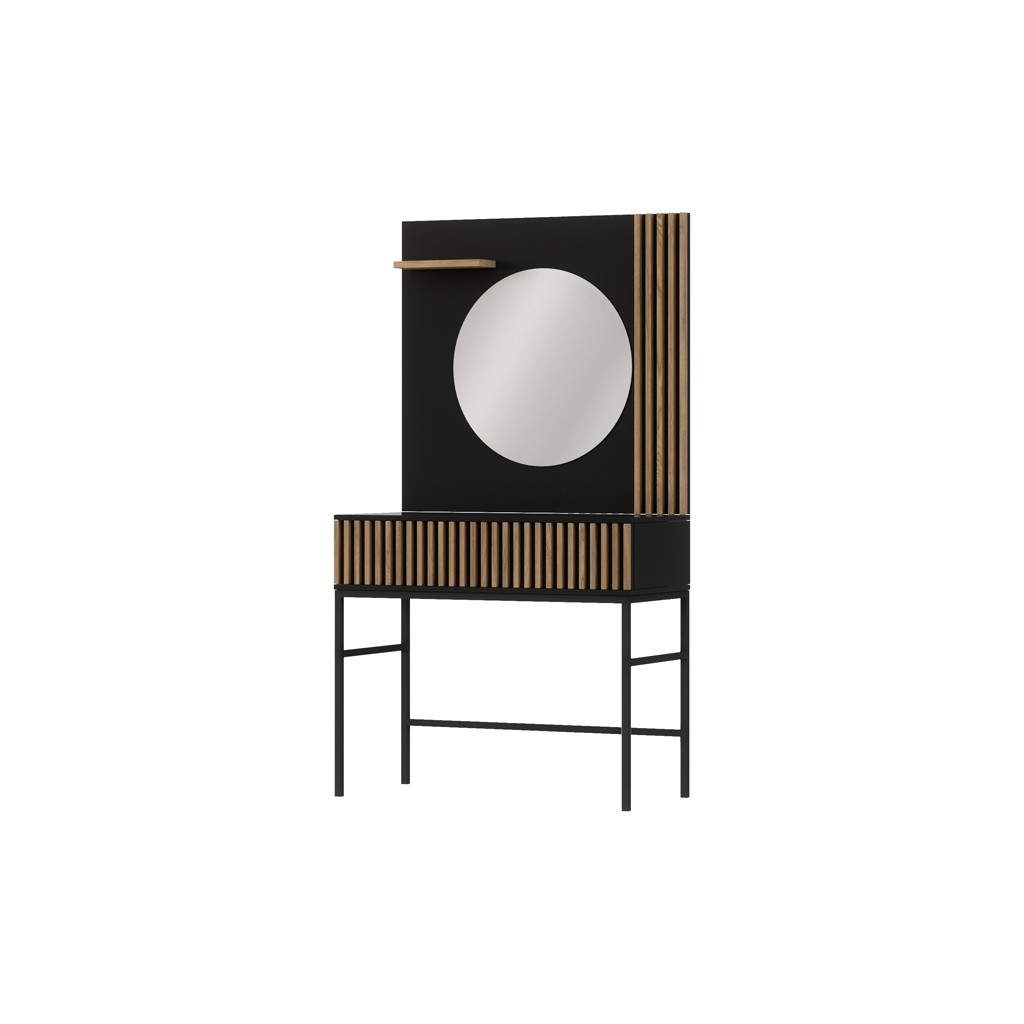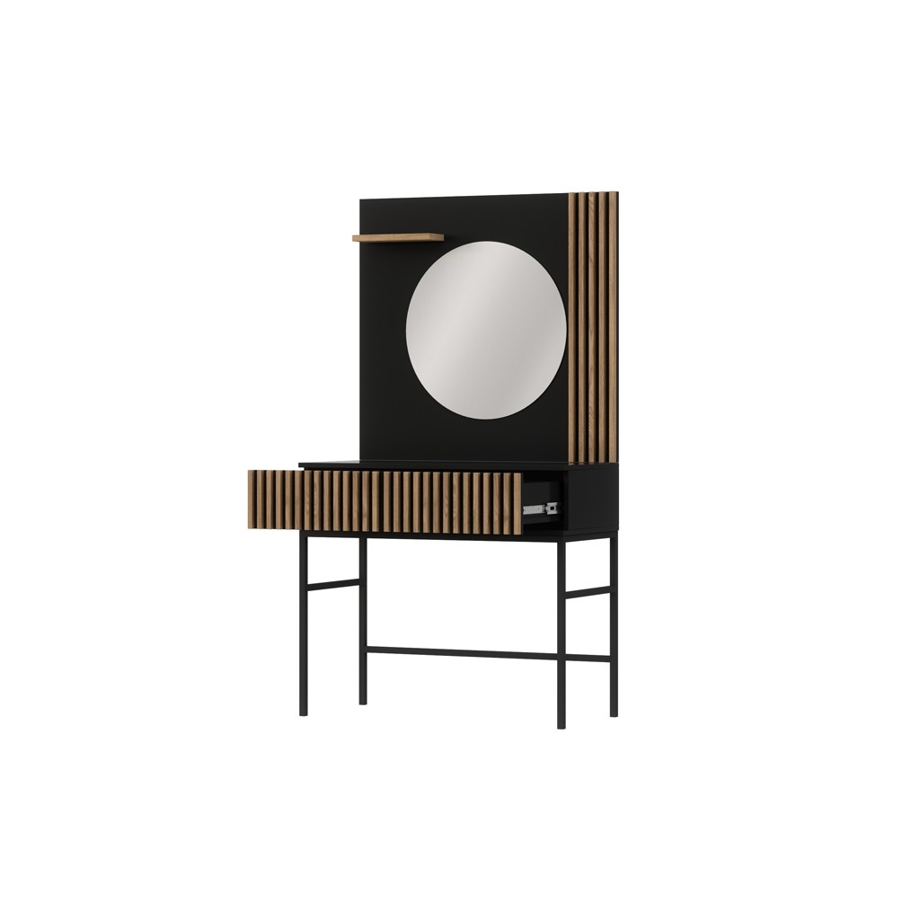 Črna kozmetična mizica MEORATI je eleganten dodatek za vašo spalnico. Kozmetična mizica ima dva predala z rezkanimi frontami v barvi hrasta, kar ji doda edinstven značaj. Ti predali so praktični in pomagajo ohranjati vaše stvari urejene in organizirane.