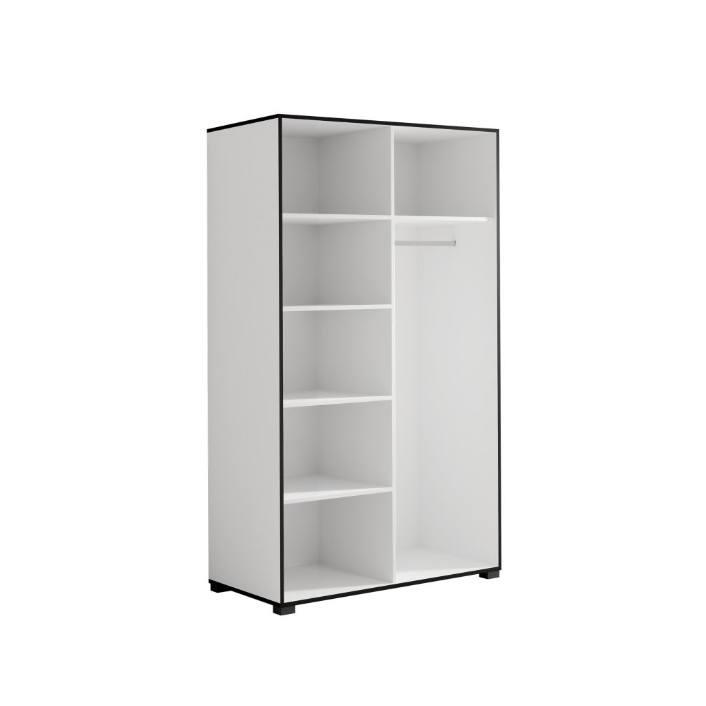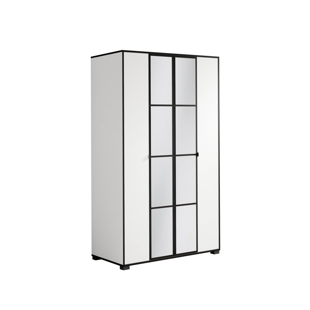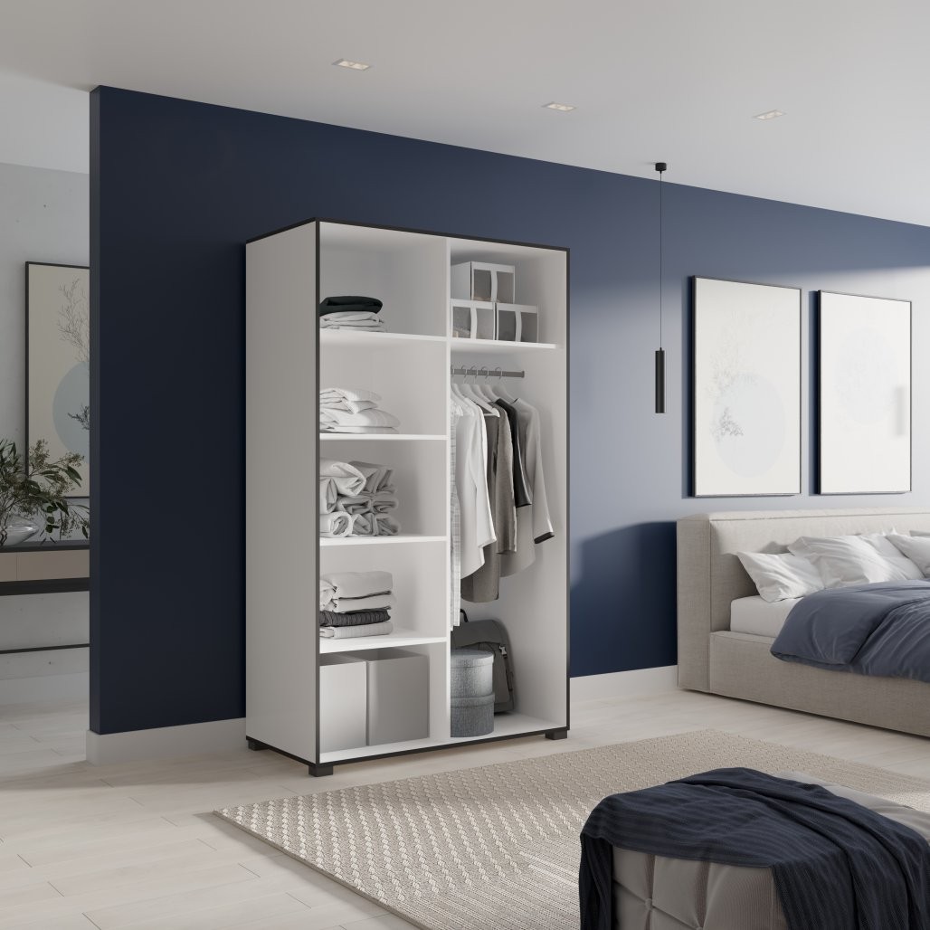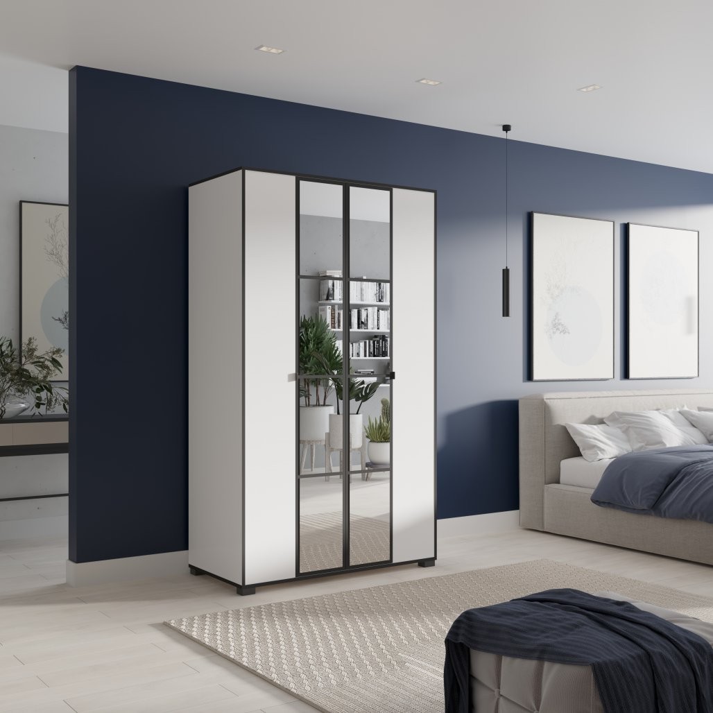 Krilna omara z ogledali OSMA 120 cm je elegantna in funkcionalna rešitev za vsak dom. S svojo moderno črno-belo barvno kombinacijo in praktično notranjo razporeditvijo je idealna za spalnice, dnevne sobe ali hodnike.