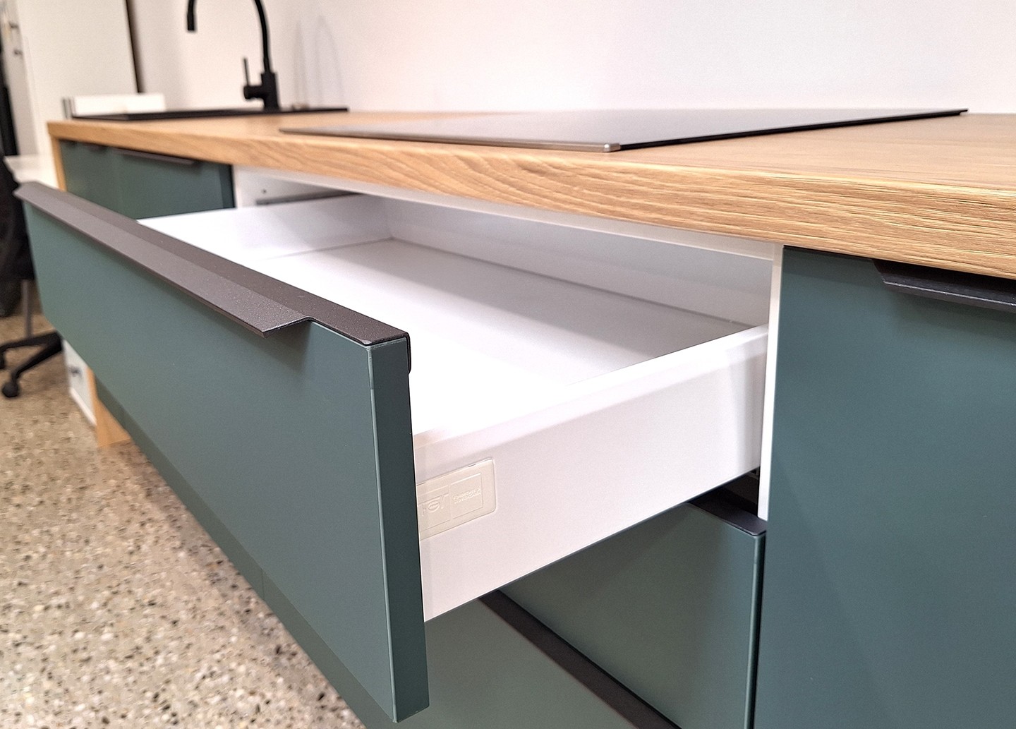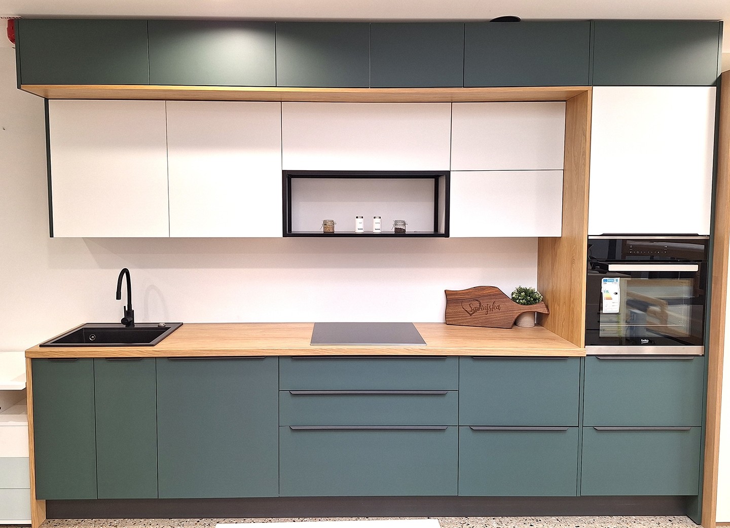 Osvežite svoj dom z moderno in kakovostno slovensko kuhinjo Selene, ki nudi sodobni videz ter obilo prostora za shranjevanje. Funkciji kot sta mehko zapiranje ter popolni izvlek predalov poskrbita za lažjo vsakodnevno uporabo ter izjemno funkcionalnost. Set je na voljo v kombinaciji snežno bele in zelene barve, ki se lepo podata v vsak dom in se enostavno kombinirata z ostalim pohištvom. Skupna dolžina kuhinje je 334 cm.