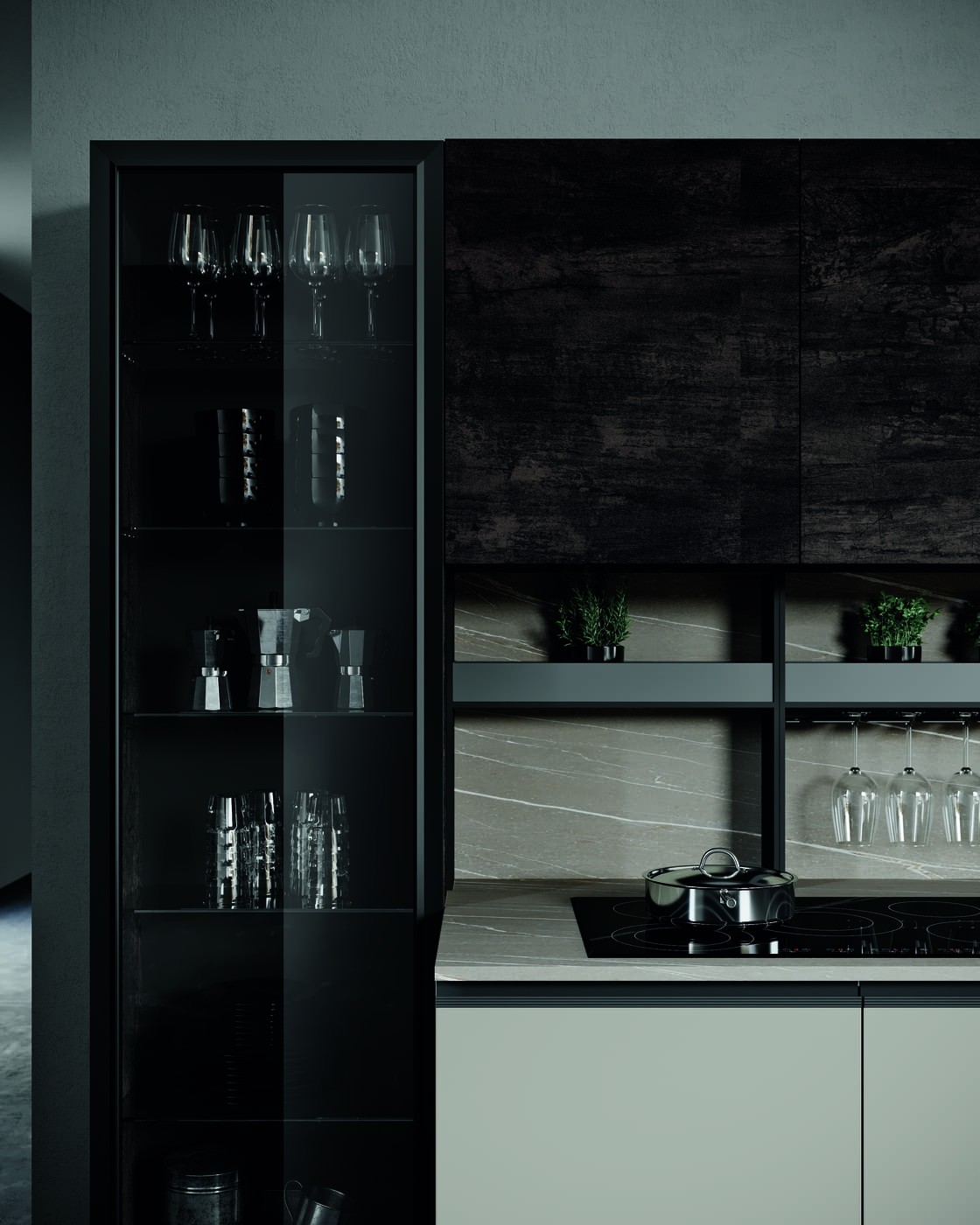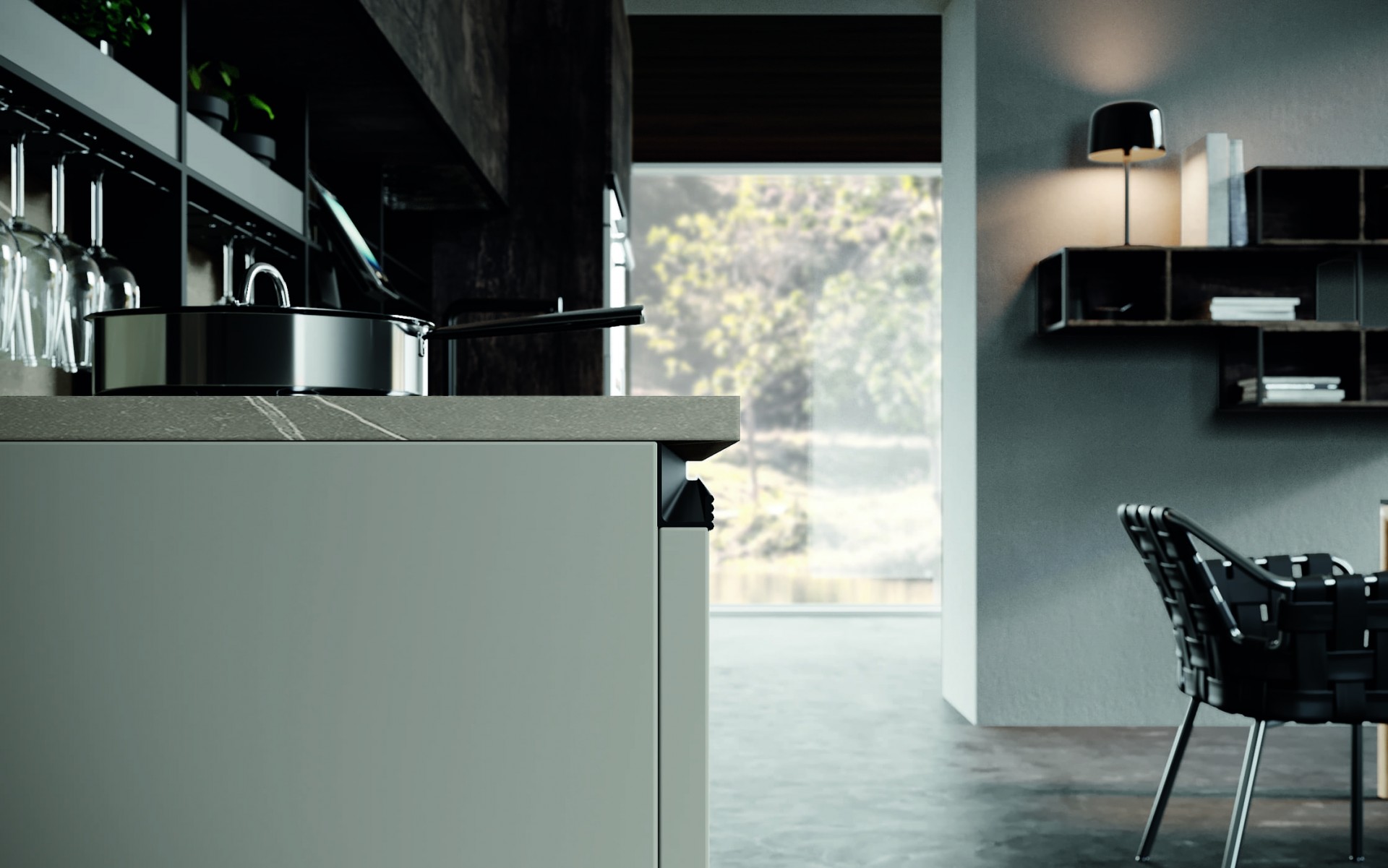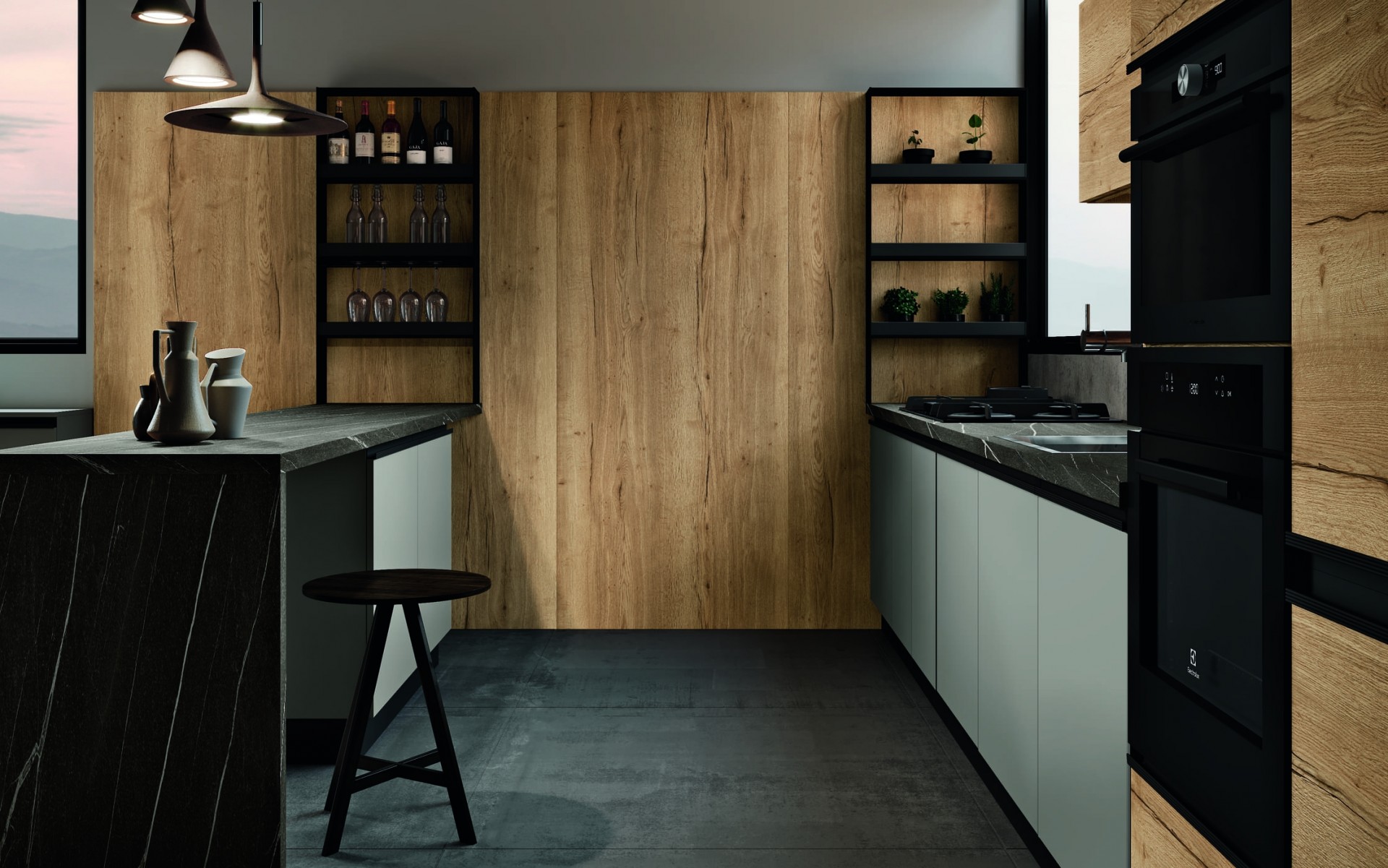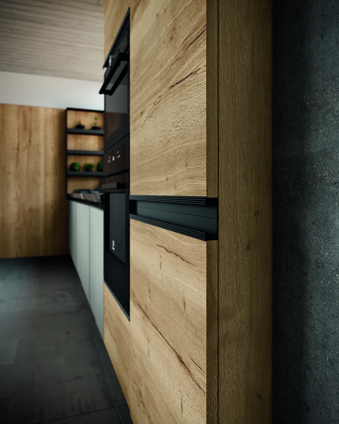 Italijanske kuhinje TEIA so izdelane iz najkvalitetnejših materialov, ki omogočajo dolgotrajno obstojnost vaše kuhinje in odpornost proti vlagi. Vsi elementi imajo vključen mehanizem za mehko zapiranje. Spodje omarice in predali vsebujejo Hettich odmične spone, zgornje omarice pa Blum mehanizme.