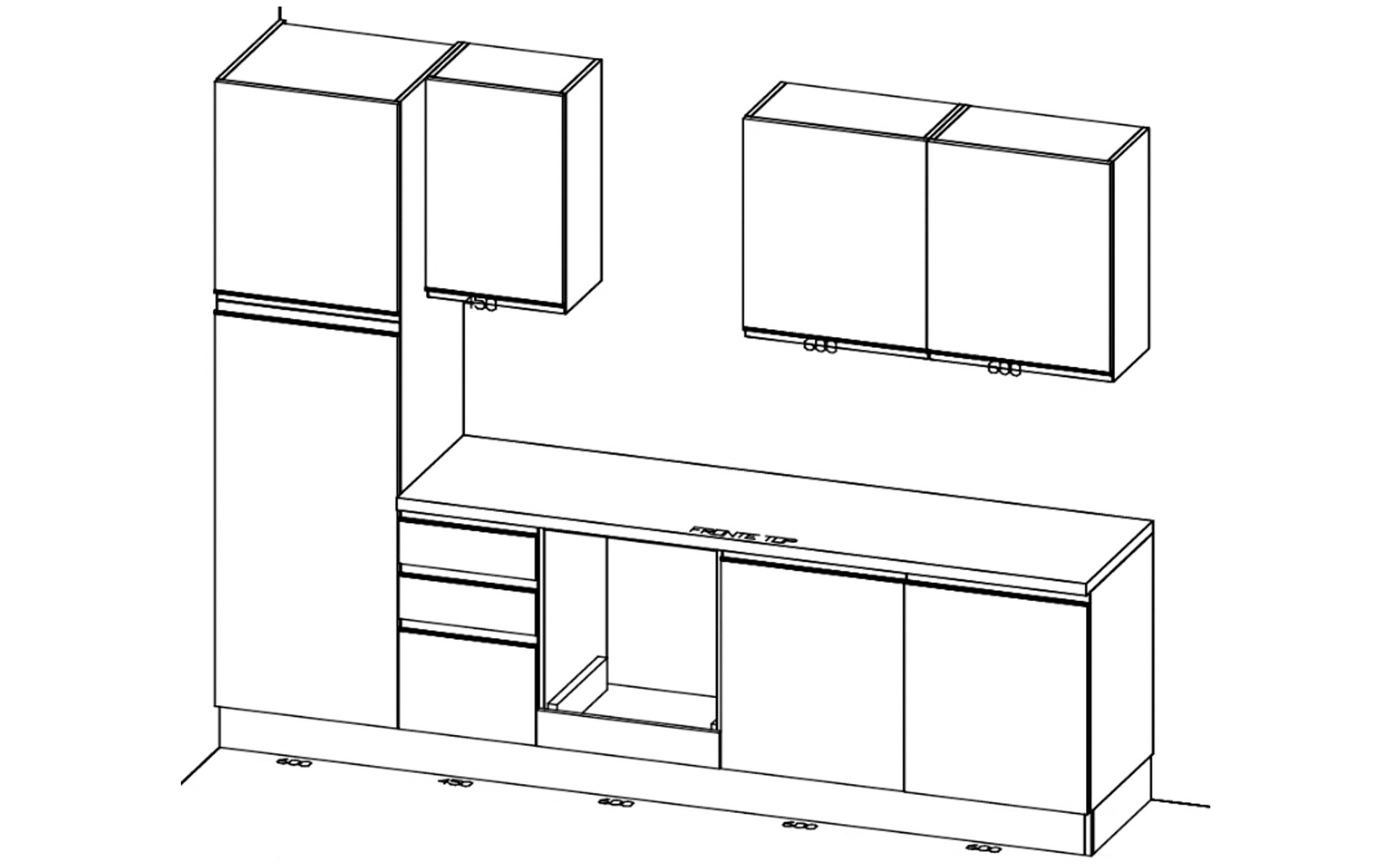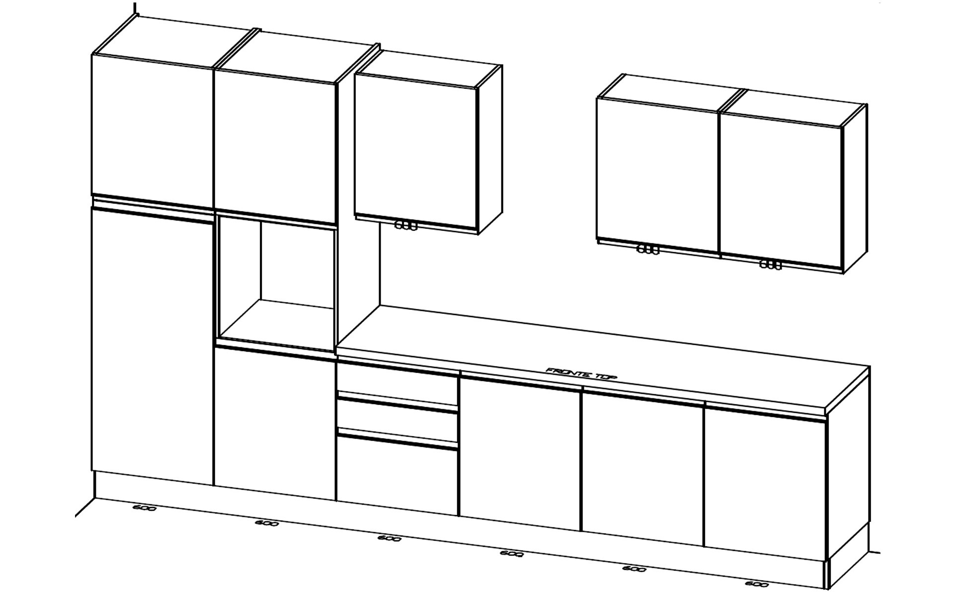 Pri sestavljanju vaše sanjske kuhinje lahko izbirate med širokim naborom barv. Fronte so lahko v različnih efektih in barvah: mat ali visok sijaj, les ali enobarvna, strukturirana... Korpus omaric pa je lahko iz dveh barv: bele ali sive. Cokli so lahko različne višine: 10, 12 ali 15cm. Pulte lahko naročite v različnih barvah