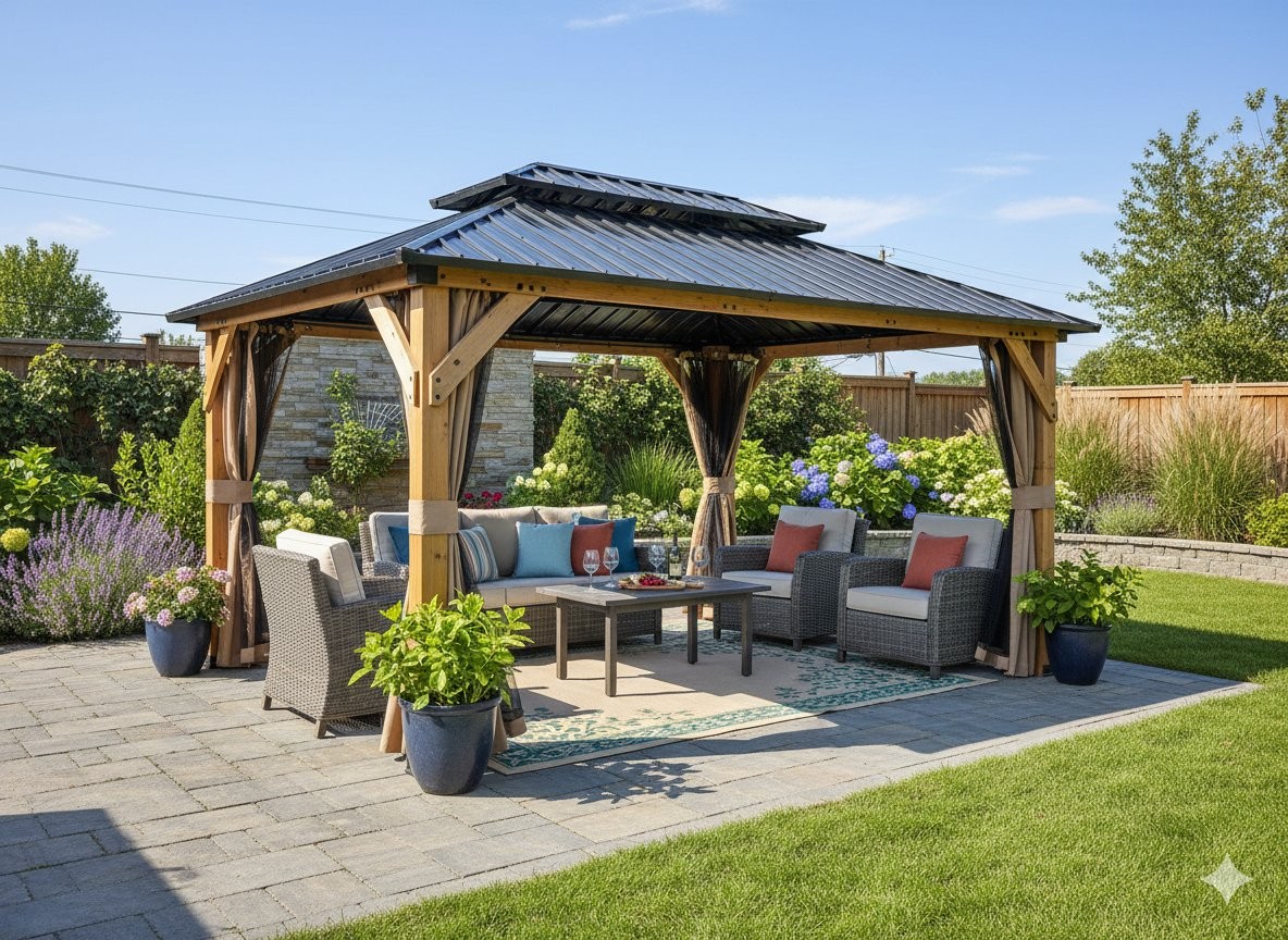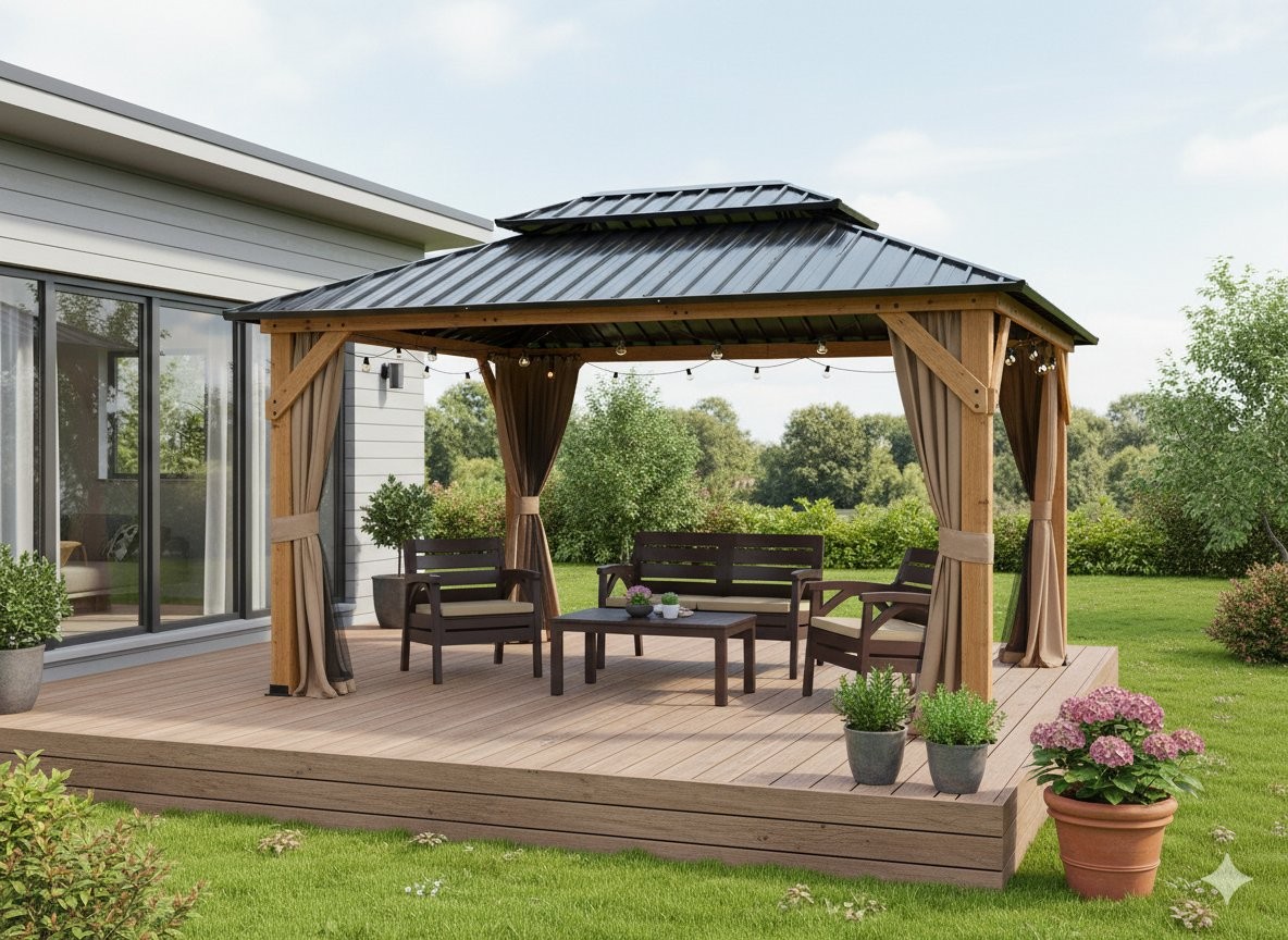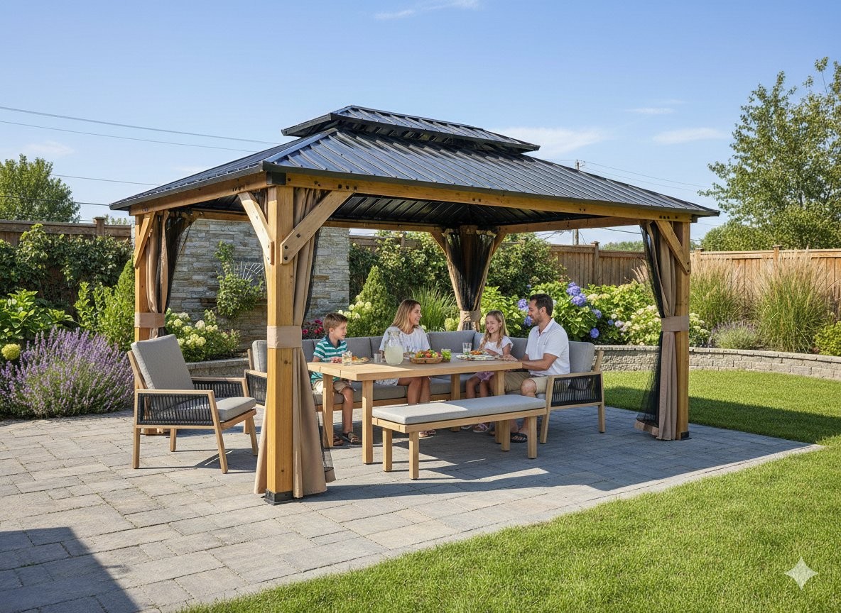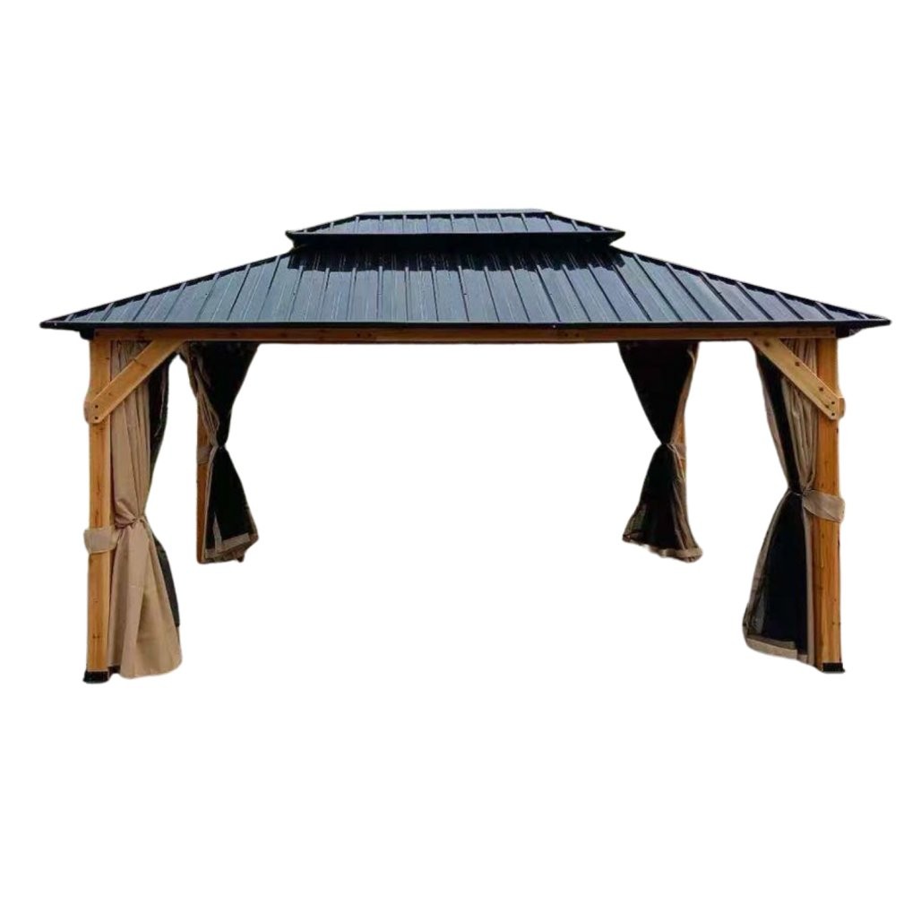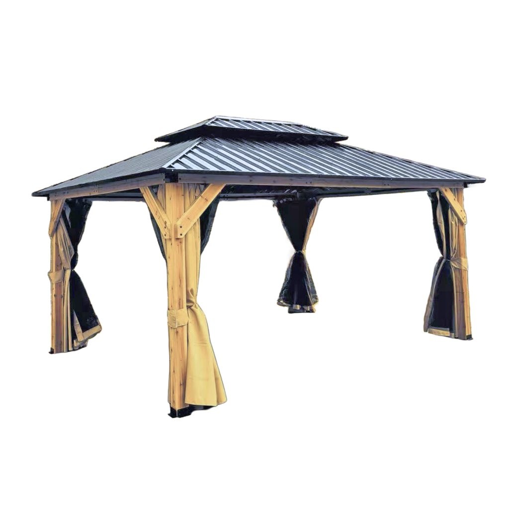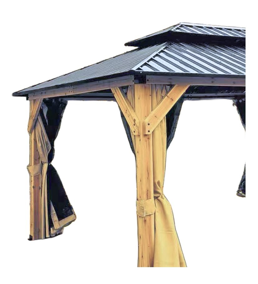 Kombinacija jelovega lesa in jeklene konstrukcije poudari naraven videz in stabilnost. Streha iz jeklene pločevine debeline 0,3 mm pomaga pri zaščiti pred soncem, dežjem in rahlo točo. Stranske stene iz poliestra povečajo zasebnost ter pomagajo pri zaščiti pred vetrom in soncem. Pocinkani spojni elementi prispevajo k odpornosti proti koroziji.