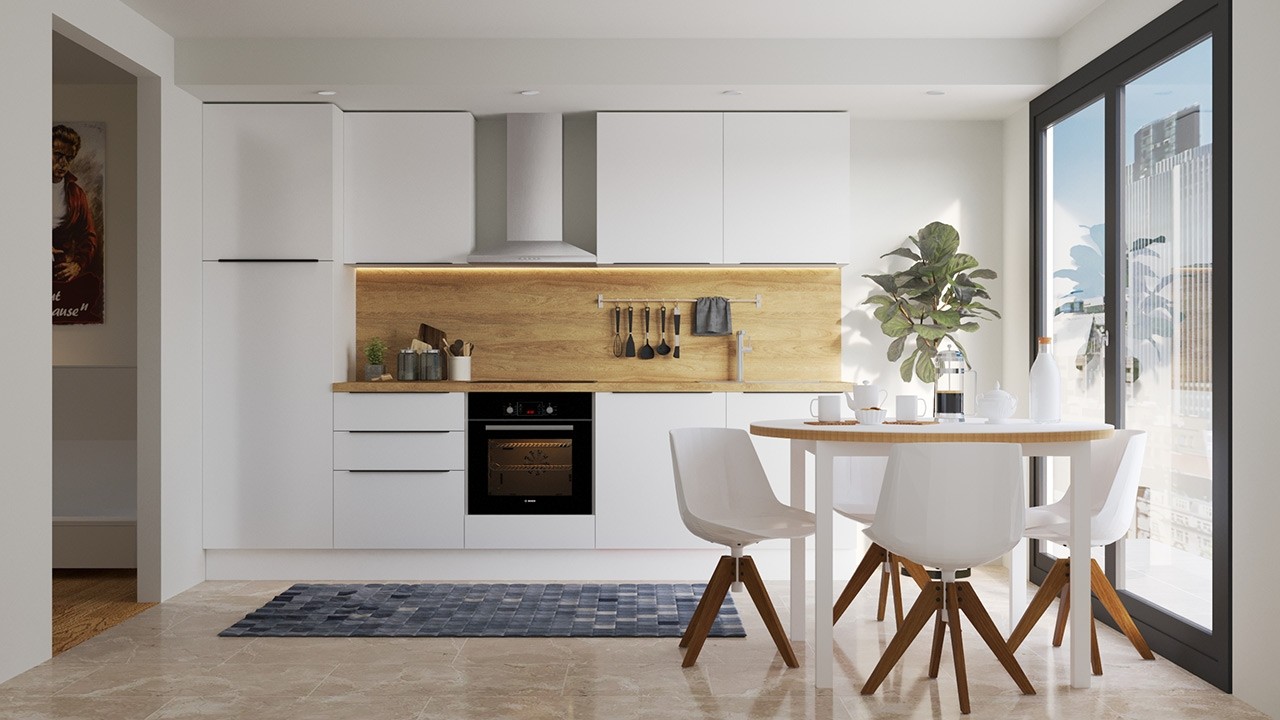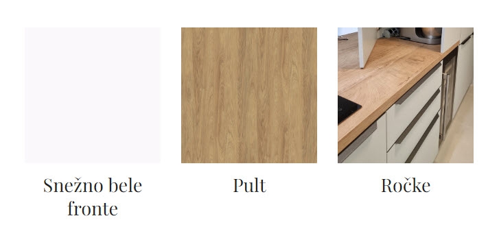 V ceno so vključeni leseni elementi kuhinje. Bela tehnika, LED lučke in stenska obloga v barvi pulta niso vključeni v ceno.