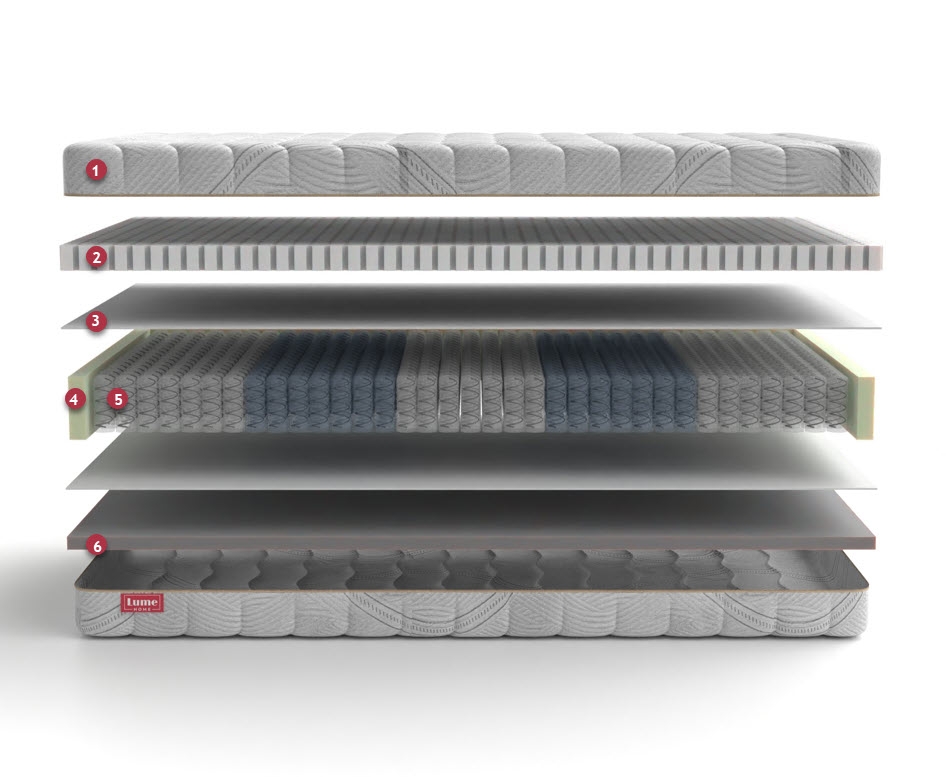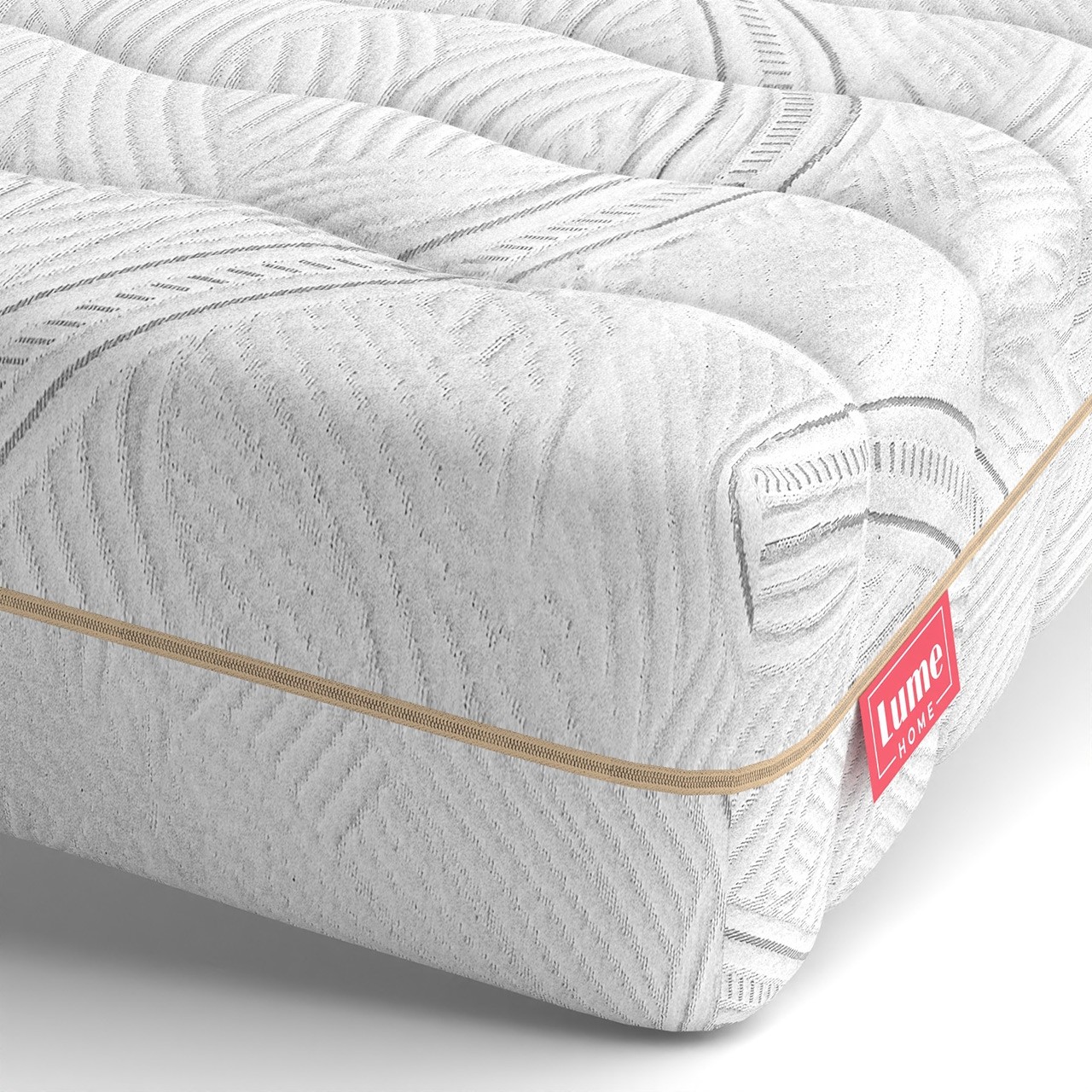 Ležišče Lume Home Relax Latex+ ima 5-consko jedro z žepkastimi vzmetmi, ki se individualno prilagajajo vašemu telesu. Vzmeti so med seboj ločene in delujejo neodvisno, kar pomeni, da se na pritisk odzivajo samo obremenjene vzmeti, druge pa mirujejo – tako je hrbtenica nenehno poravnana in v pravilni legi, mišice pa so sproščene.