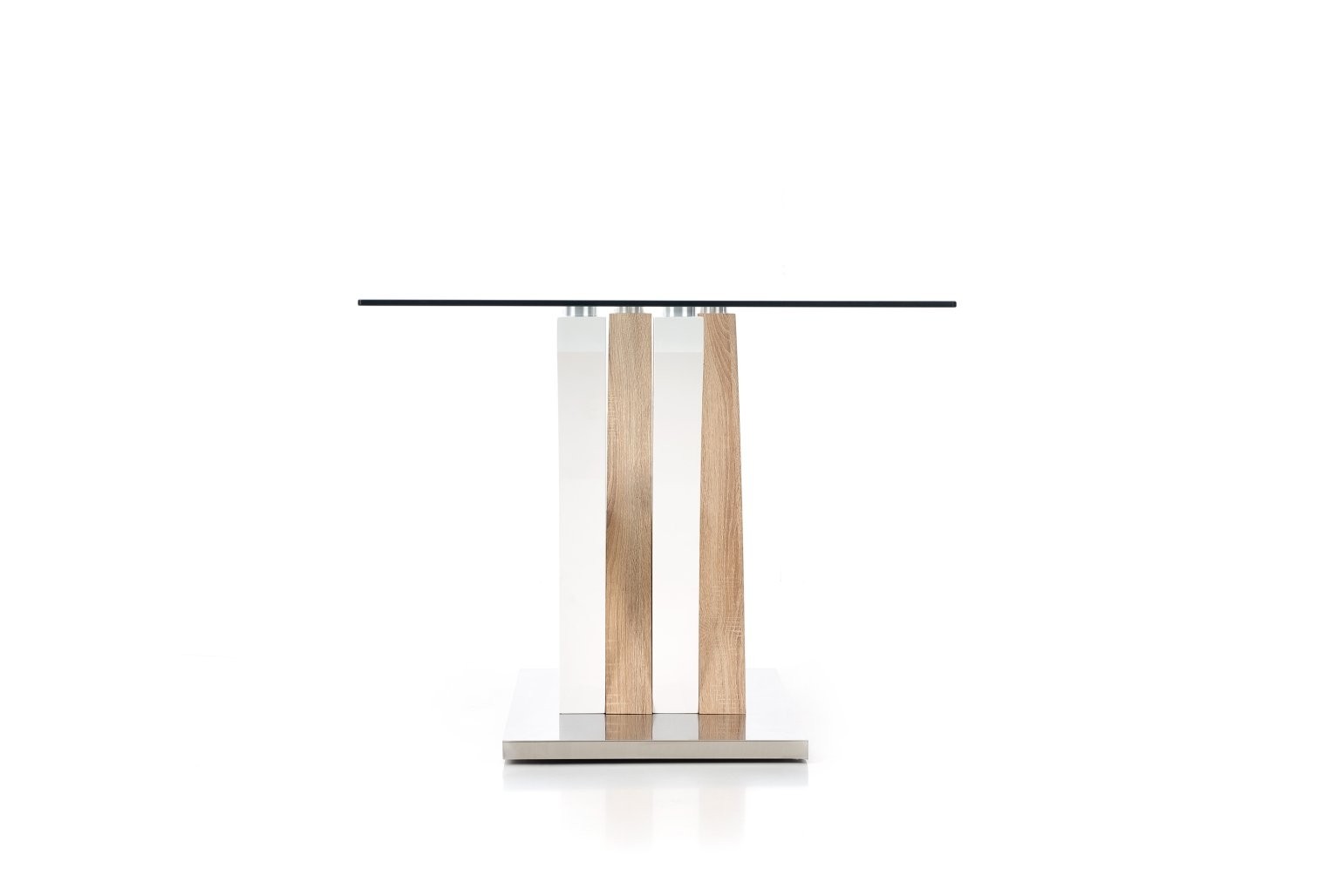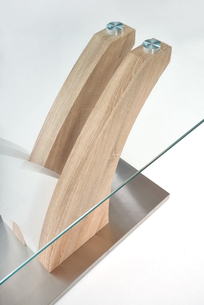 Miza Anron z dolžino 160 cm, s površino iz stekla, lakiranega in laminiranega MDF-ja. Popolna izbira za sodobne prostore s kombinacijo sonoma hrasta in bele barve.