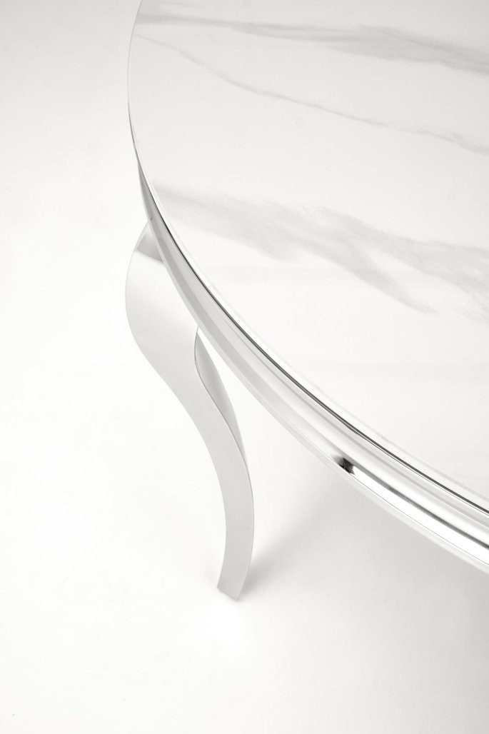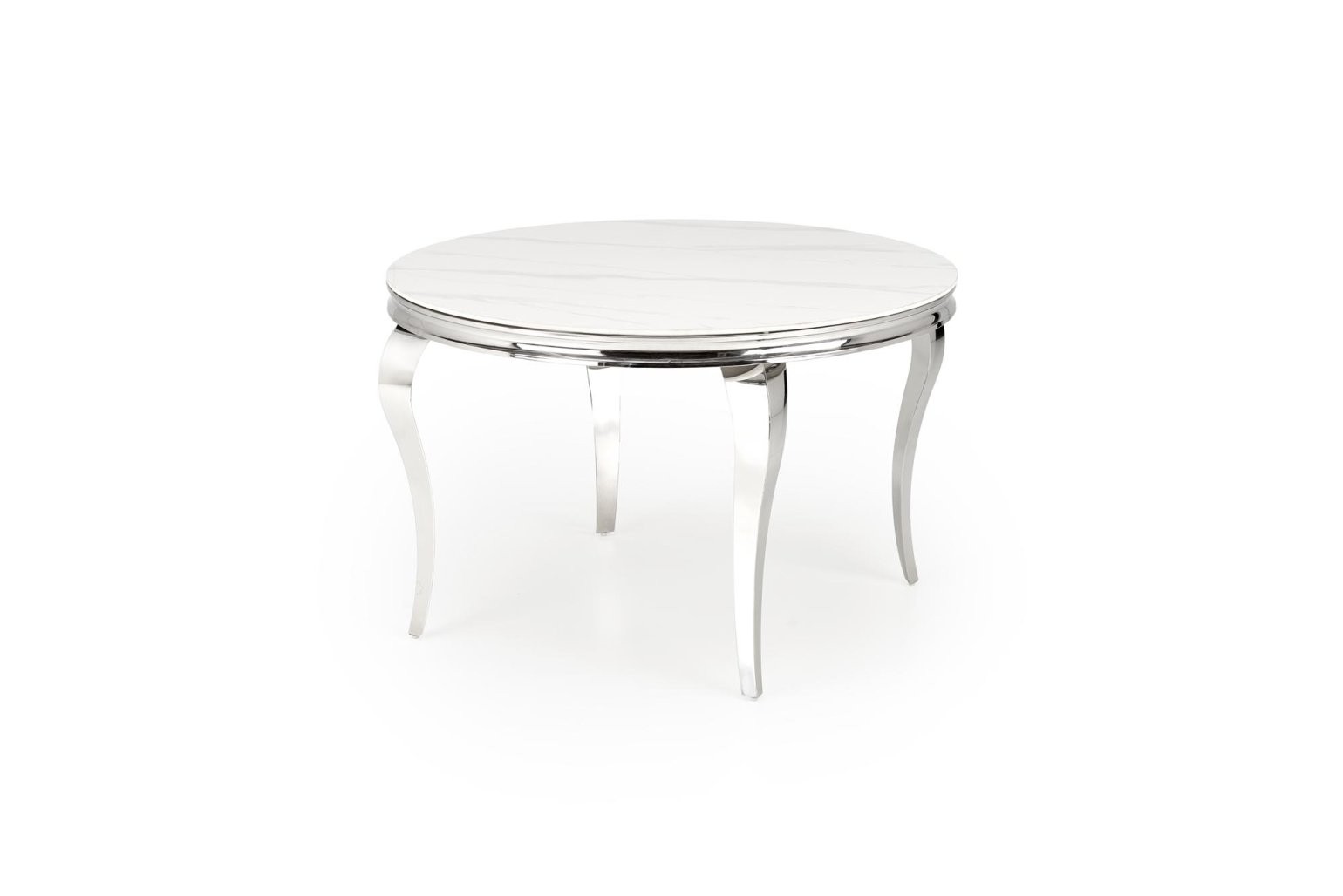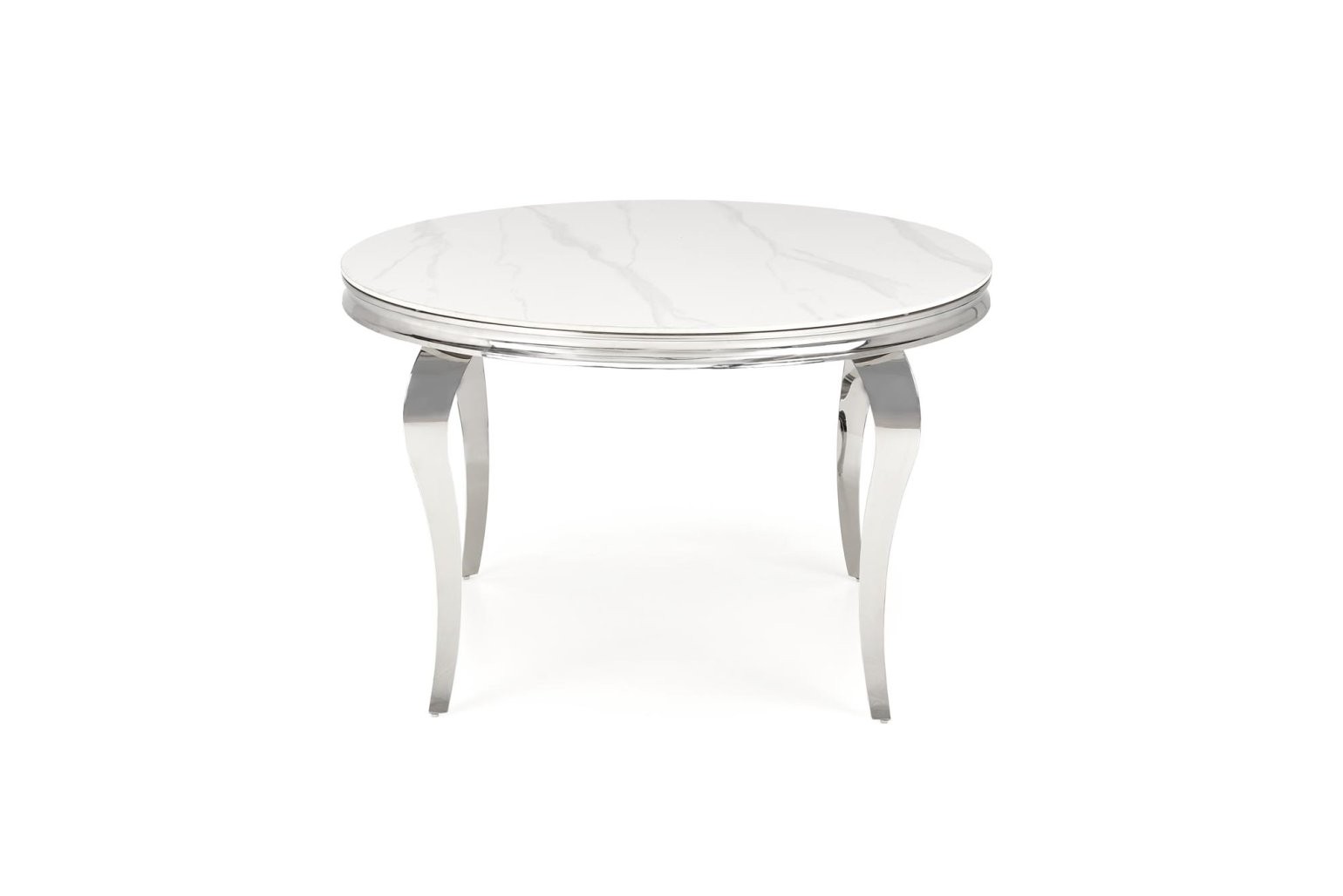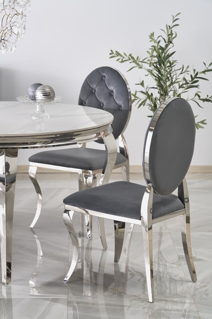 Miza Belran, sodobna elegantna izbira s ploščo iz belega marmorja in srebrnimi kovinskimi nogami. Popoln dodatek za jedilnice, primerna za pet oseb.