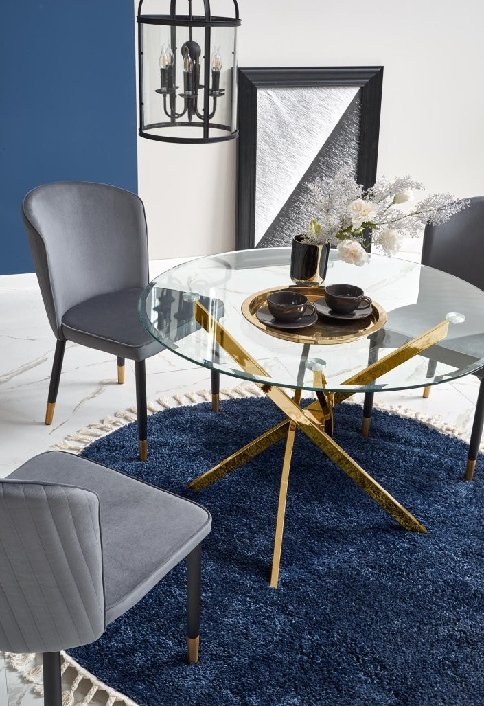 Miza Doren združuje sodoben videz s klasično eleganco z okroglo stekleno površino in zlatimi jeklenimi nogami. Pristaja v prestižne in moderne prostore, primerna za 4 osebe.
