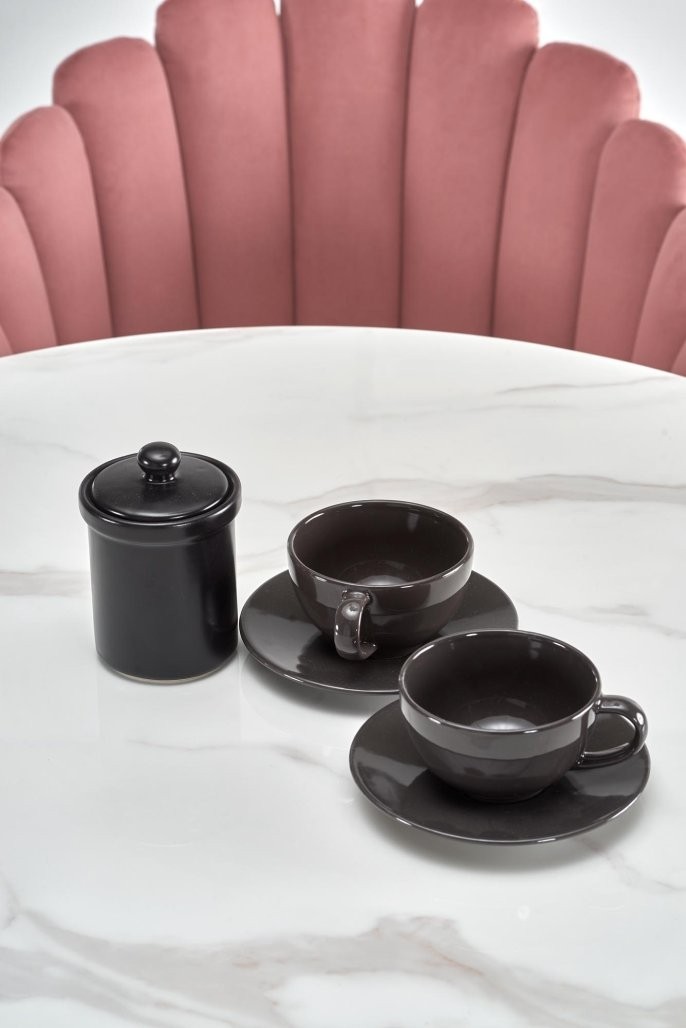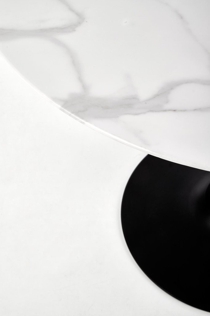 Miza Lira s stekleno ploščo v belem marmorju in črnimi kovinskimi nogami je prefinjena in sodobna izbira. Okrogla oblika je idealna za manjše prostore, primerno za tri osebe.