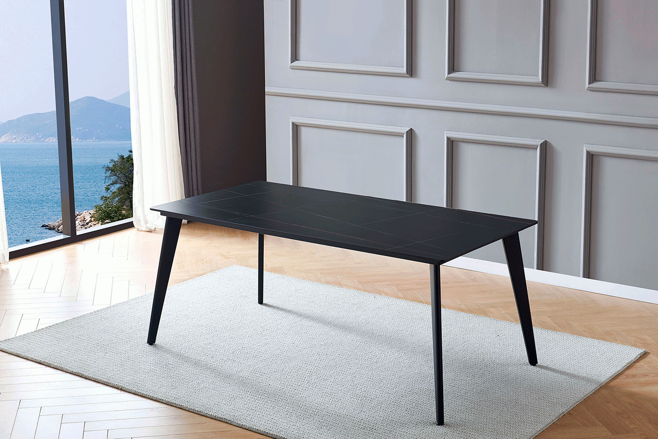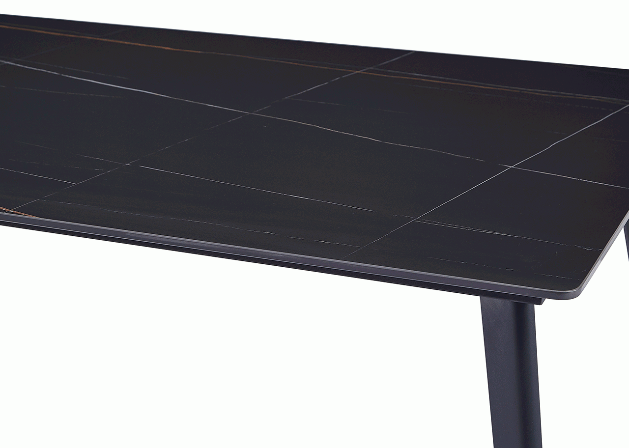 Preprosta jedilna miza z videzom črnega marmorja z zlatim pridihom. Enostavnost in barva te mize omogočata, da je ta miza lahko v vsakem jedilnem prostoru. Plošča je narejena je iz kvalitetnega sintranega kamna kar daje kakovost mizi v smislu trpežnosti. Podpora namizne plošče je narejena iz MDF materiala. Noge so narejene iz kovine, nosilnost mize pa znaša 120 kg. Noge mize so lakirane v črno barvo za boljšo zaščito. Kvalitetni materiali, ki so bili uporabljeni na tej mizi so tudi okolju prijaznešji, kar je še dodaten razlog, da ta miza mora priti v vaš dom.