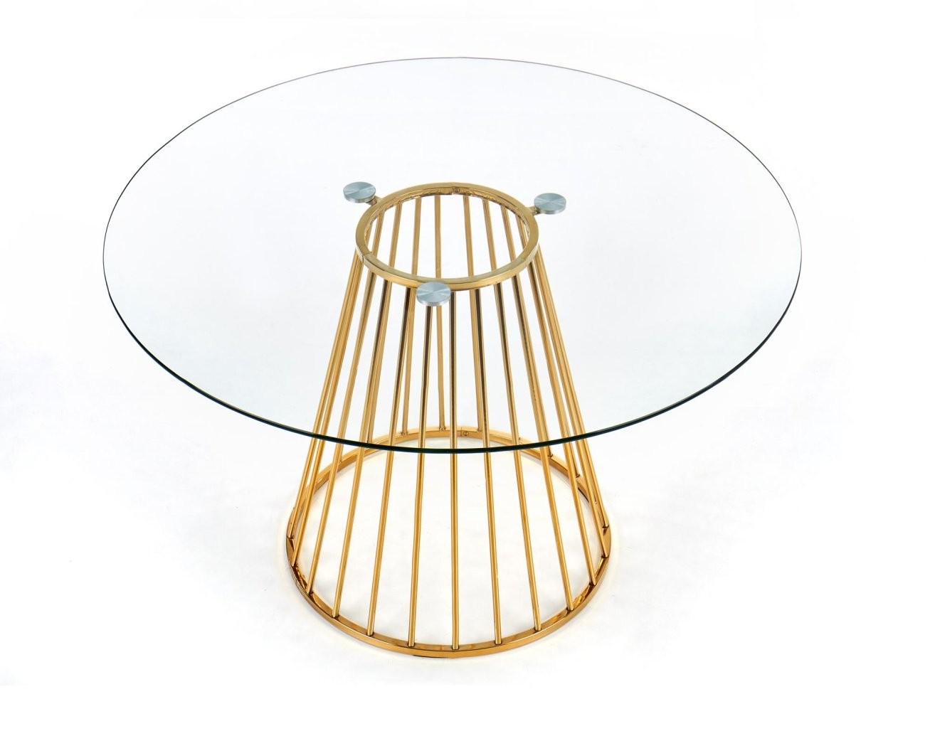 Miza Reln z okroglo stekleno ploščo in zlatimi kovinskimi nogami. Elegantna miza, primerna za do 5 oseb, ki doda pridih luksuza vsakemu ambientu.