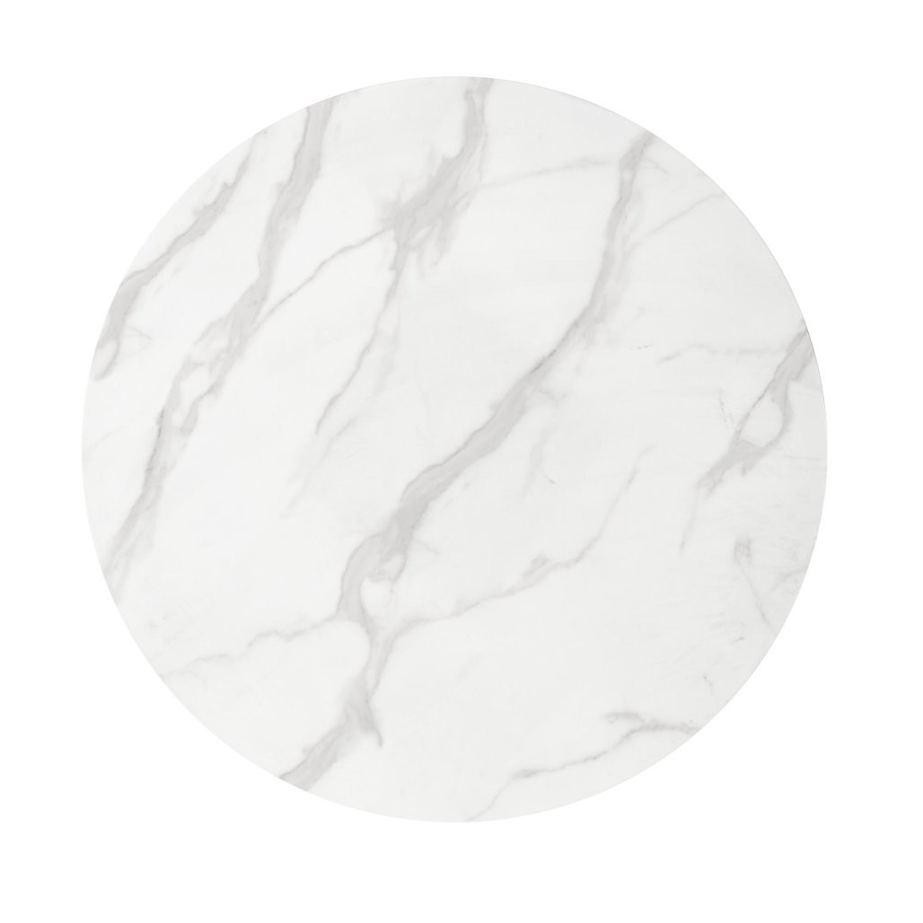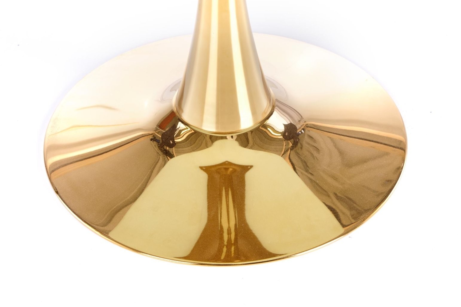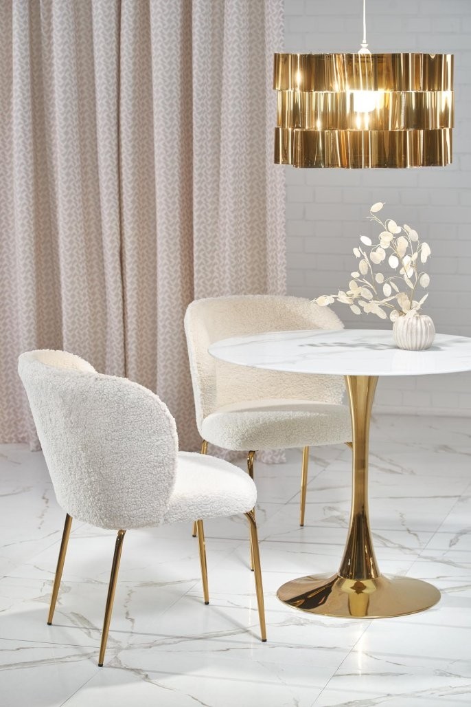 Miza Telan z prestižnim dizajnom in okroglo stekleno ploščo v videzu belega marmorja ter z zlatim kromiranim ogrodjem. Idealna za sodobno jedilnico ali dnevni prostor.