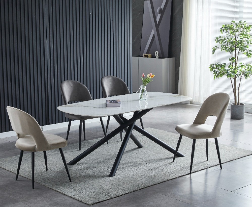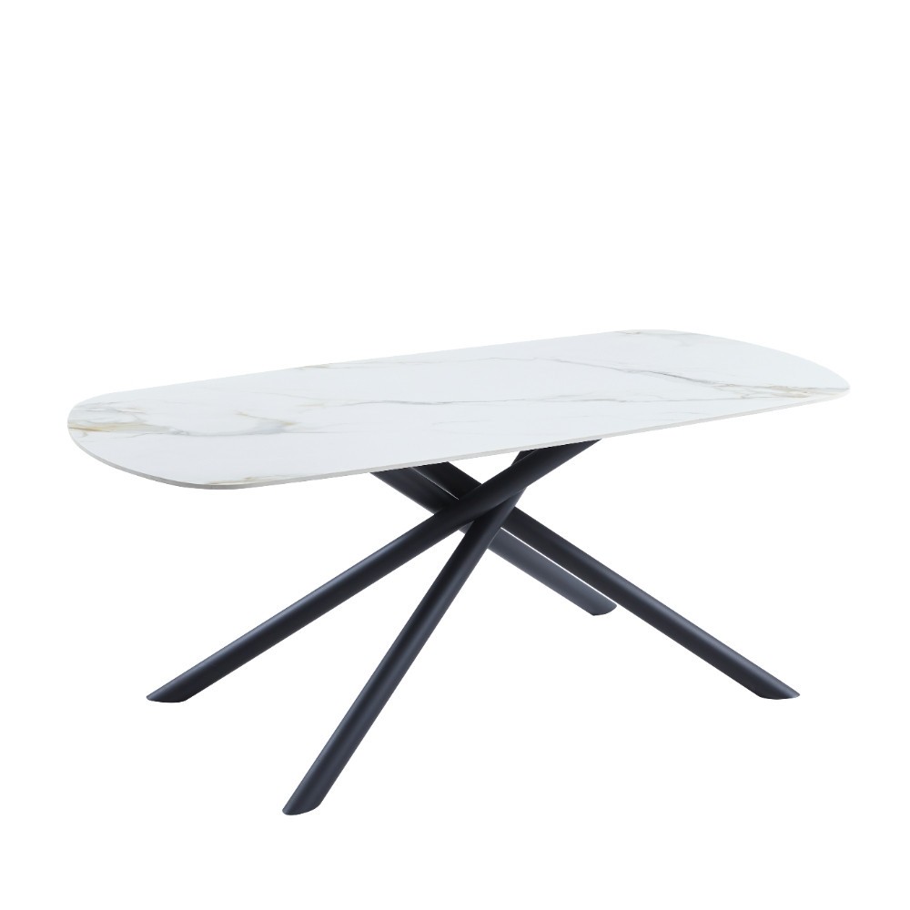 Velika jedilna miza ZUG se bo odlično podala v vsako moderno jedilnico. Ta čudovita miza v barvi belega marmorja z zlatimi žilami bo popestrila vsak prostor in v njega prinesla vzdušje luksuza. Narejena je iz kakovostnega sintranega kamna ki je močnejši od keramike, vodoodporen in okolju prijaznejši od kemično obdelanih plošč. Poseben dodatek so kovinske noge, ki so prepletene v abstraktnem motivu in prašno lakirane v črno barvo.