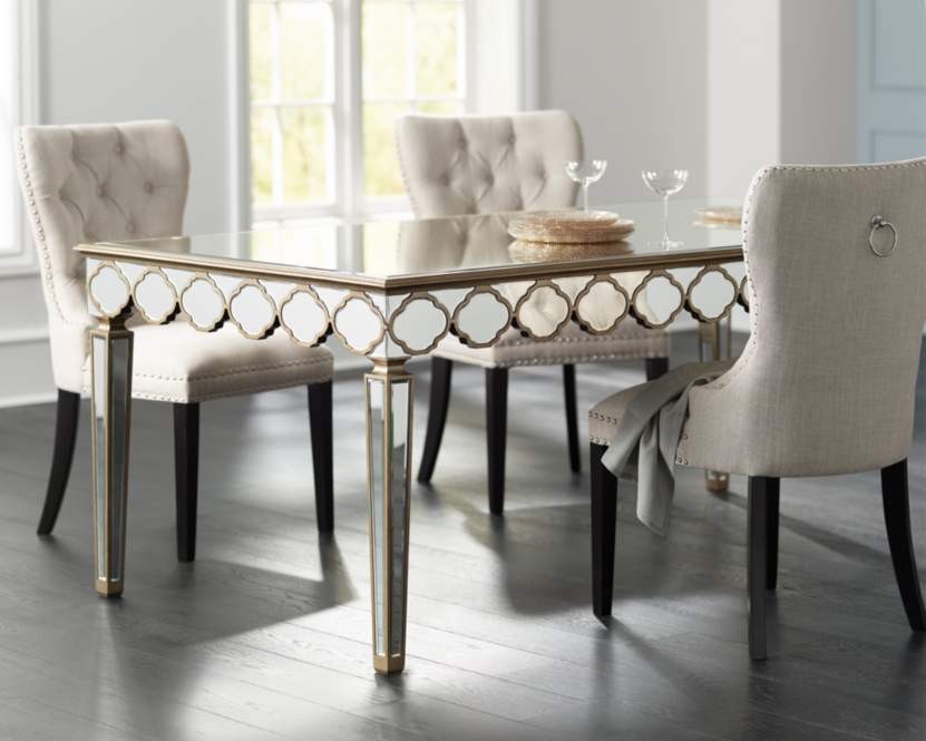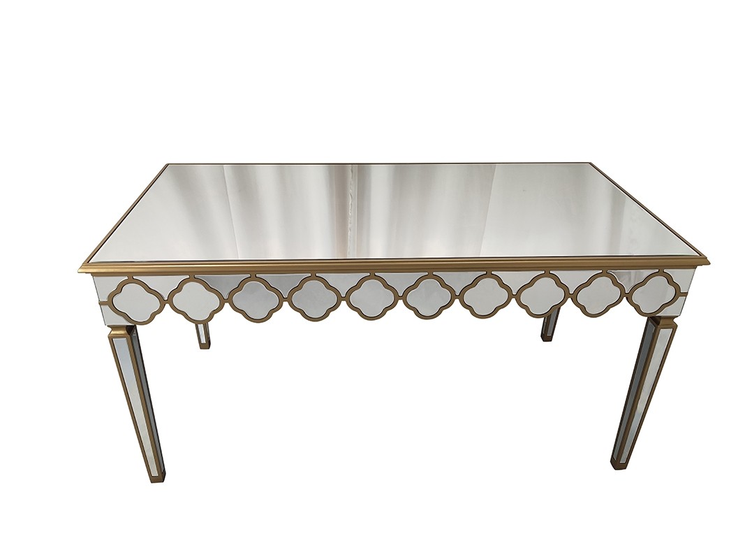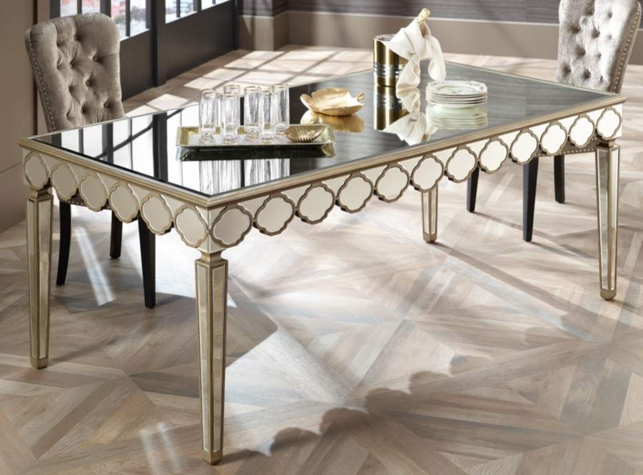 Prestižna in elegantna jedilna miza ROVNER GLAM pritegne pozornost vsakega gosta in ustvari elegantno jedilnico. Izdelana je iz kvalitetnega MDF materiala in ogledal, ki so barvana v srebrno barvo. Linije in detajli so poudarjeni z zlato barvo, ki ustvari občutek klasične elegance. Oglejte si še ostale izdelke iz linije GLAM in ustvarite enotno podobo elegance in prestiža v vašem domu.