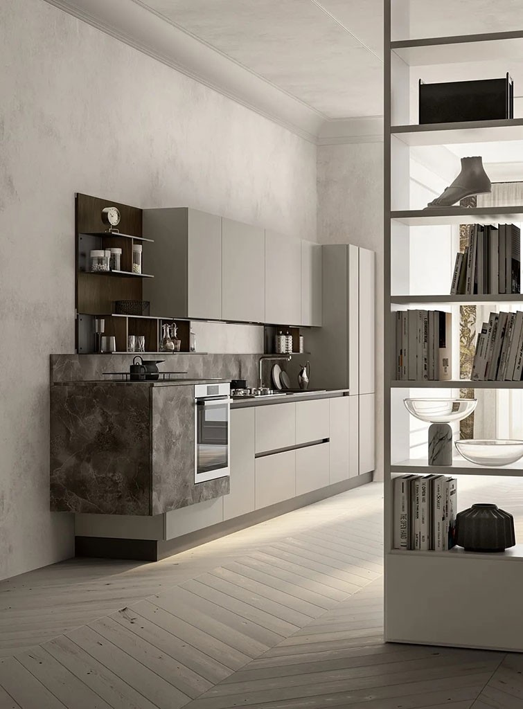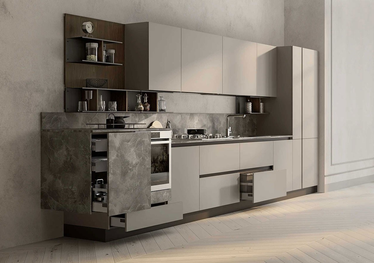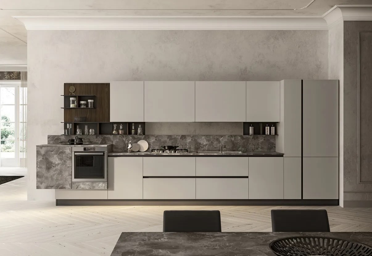 Moderna kuhinja LUNGOMARE se ponaša z inovativnim in ergonomsko oblikovanim dizajnom, ki bo vašo kuhinjo postavila v središče pozornosti. Kuhinja je skrbno izdelana in oblikovana na način, ki omogoča sodoben dizajn in preprosto uporabo. Nudi vam obilo delovne površine ter prostora za shranjevanje vseh vaših kuhinjskih pripomočkov!