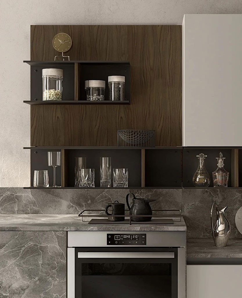 Kuhinja LUNGOMARE je sestavljena iz številnih različnih elementov, ki vam nudijo obilo prostora za shranjevanje hrane, posode, kozarcev in vseh ostalih kuhinjskih pripomočkov. Kuhinjski pult vam nudi obilo delovne površine na katero lahko odložite aparat za kavo, toaster, grelnik vode in obilo drugih aparatov.