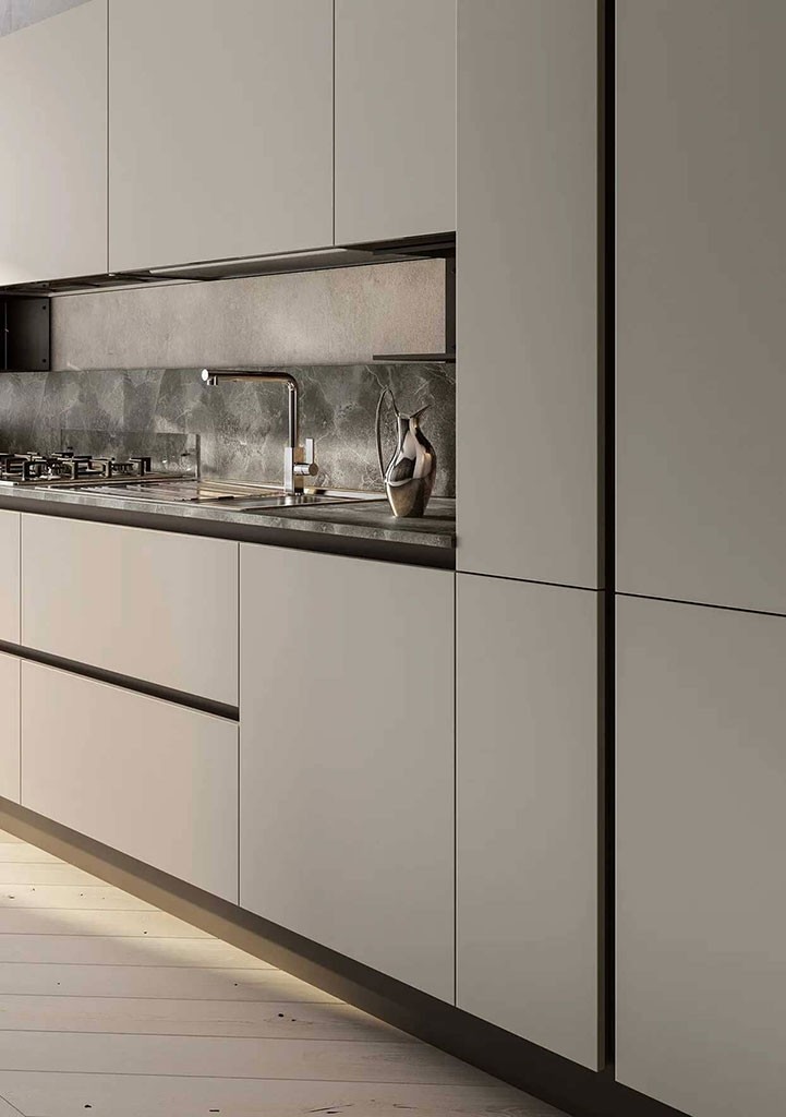Kuhinja LUNGOMARE se ponaša z modernim dizajnom, ki vedno pritegne pozornost. Gladke linije pulta in front, ki ne vsebujejo klasičnih ročk se skupaj zlijejo v harmonično celoto in ustvarijo inovativen videz. Kuhinja je na voljo v številnih skrbno izbranih barvah, ki še dodatno pripomorejo k modernemu videzu.