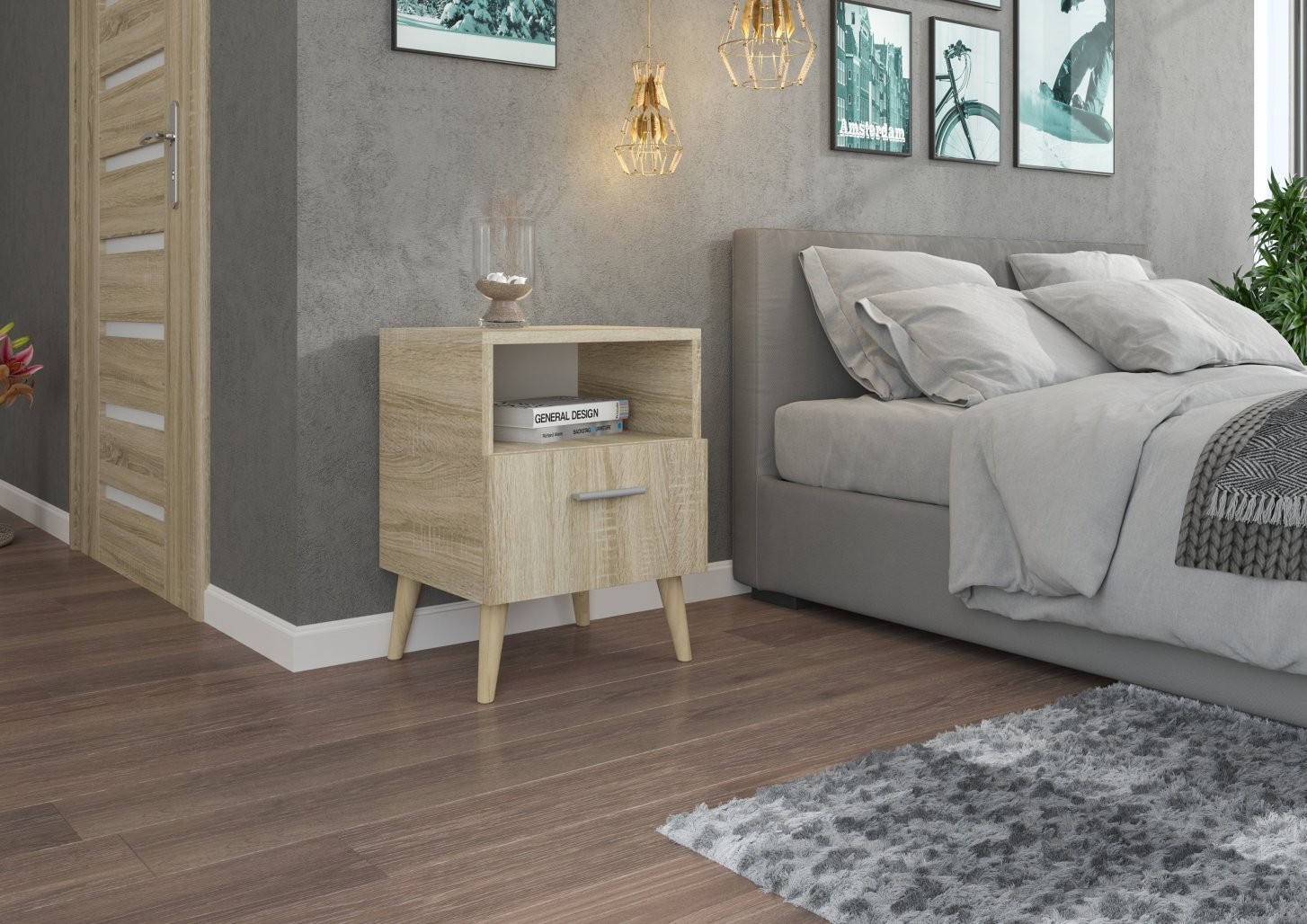 Moderna nočna omarica LOGAN s predalom (sonoma) je popolna izbira za vašo spalnico ali otroško sobo. S svojo elegantno in sodobno zasnovo se brez težav prilega vsakemu prostoru, hkrati pa ponuja praktično rešitev za shranjevanje.
