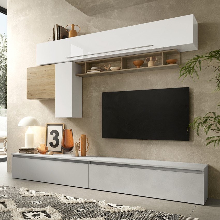 Ta modularna sestava omogoča optimalno organizacijo prostora in elegantno postavitev televizorja ter dekorativnih elementov. S svojo vsestranskostjo se prilagaja različnim stilom opremljanja – od klasičnega do minimalističnega.