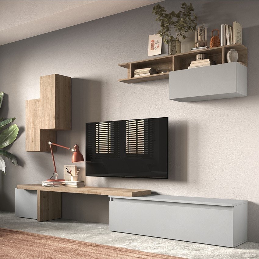 Set vključuje TV omarico z dvižnimi vrati, tri viseče omarice z vrati in polico s predelki. Modularna sestava omogoča prilagoditev vašim prostorskim potrebam in željam po organizaciji.