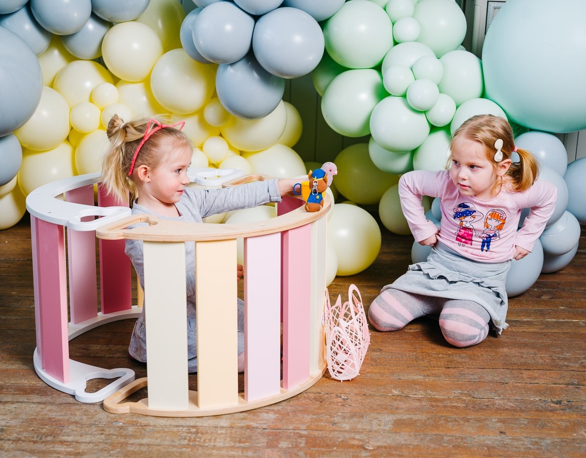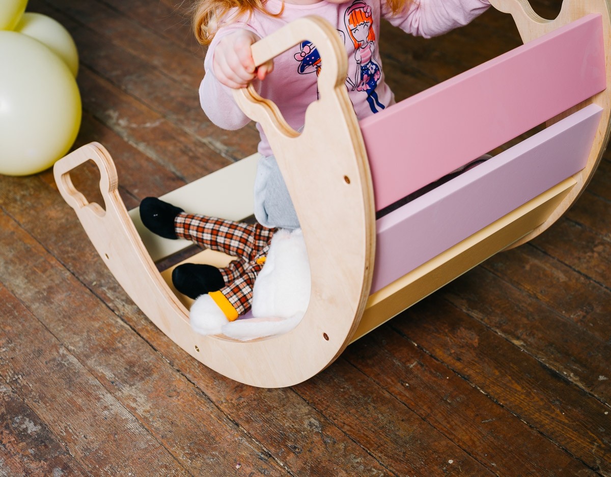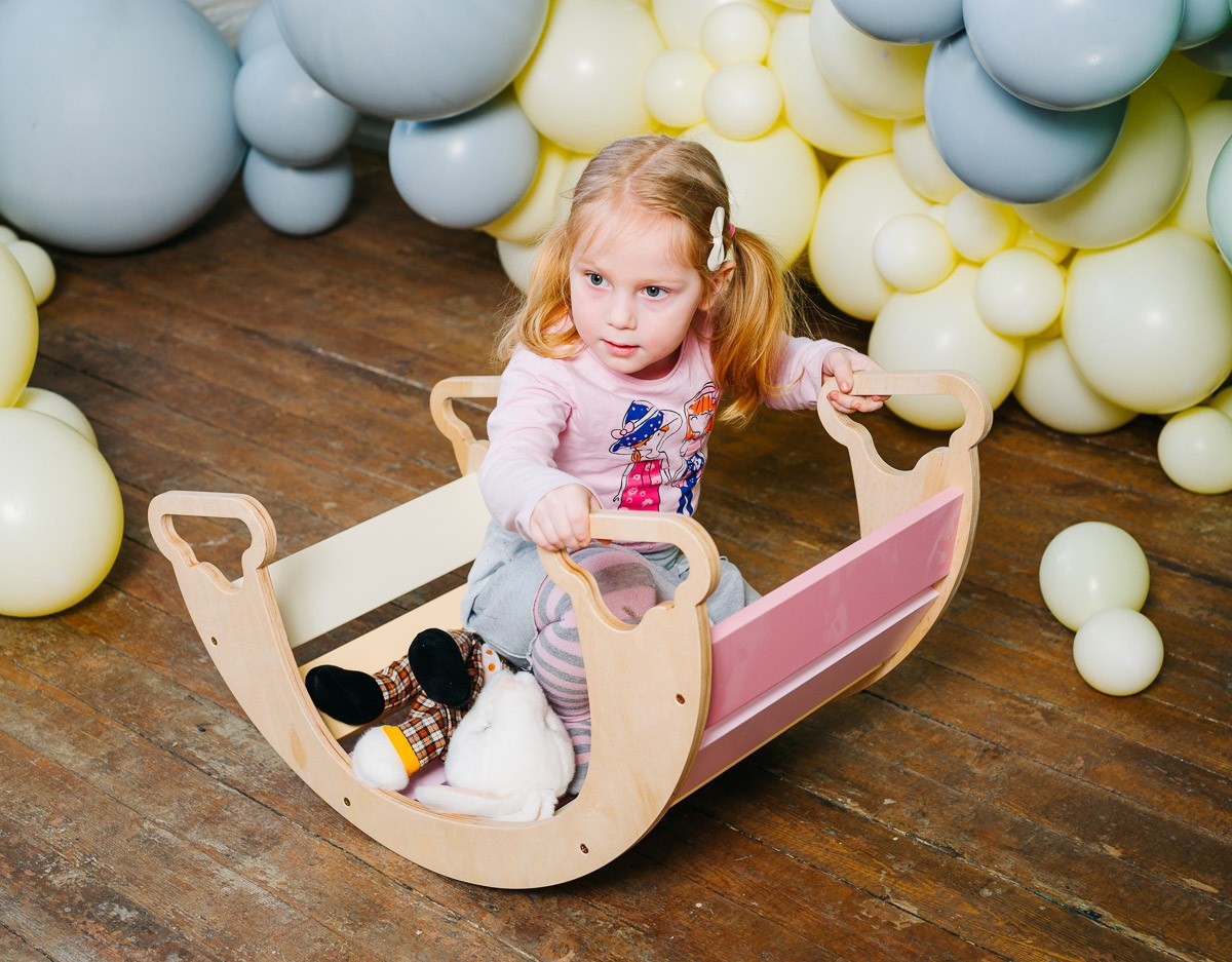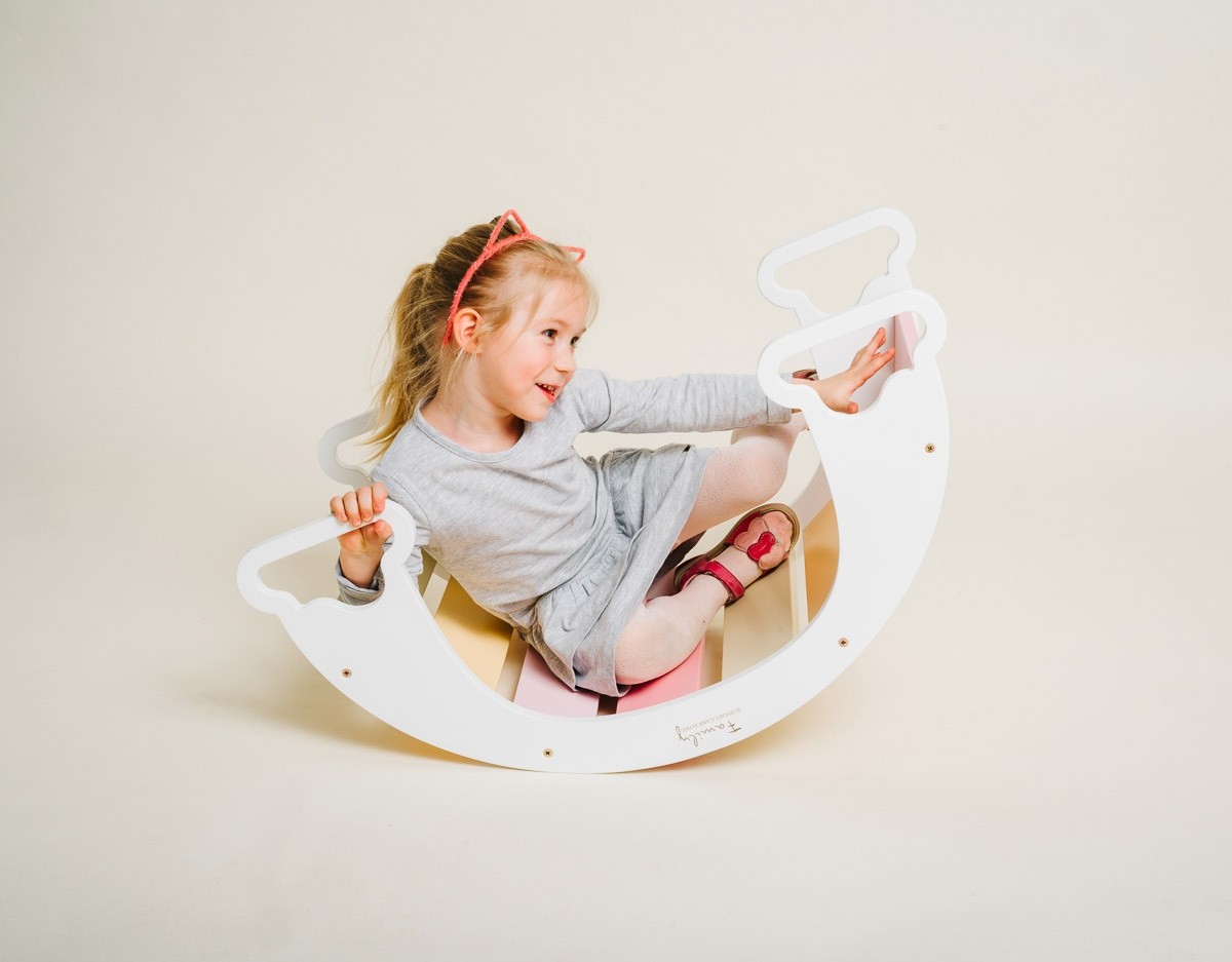 MONTESSORI GUGALNICA - GELATO omogoča vašemu otroku, da bo lažje razvil svoje motorične in kognitivne sposobnosti. Je multifunkcijska igrača, katero lahko otrok uporablja na tri različne načine: za plezanje, kot gugalnico ali kot pult za katerim se lahko otrok igra trgovino, knjižnjico, in podobno. Letvice so na voljo v različnih pastelnih barvah, za barvo ogrodja pa lahko izbirate med natur, belo in sivo barvo.