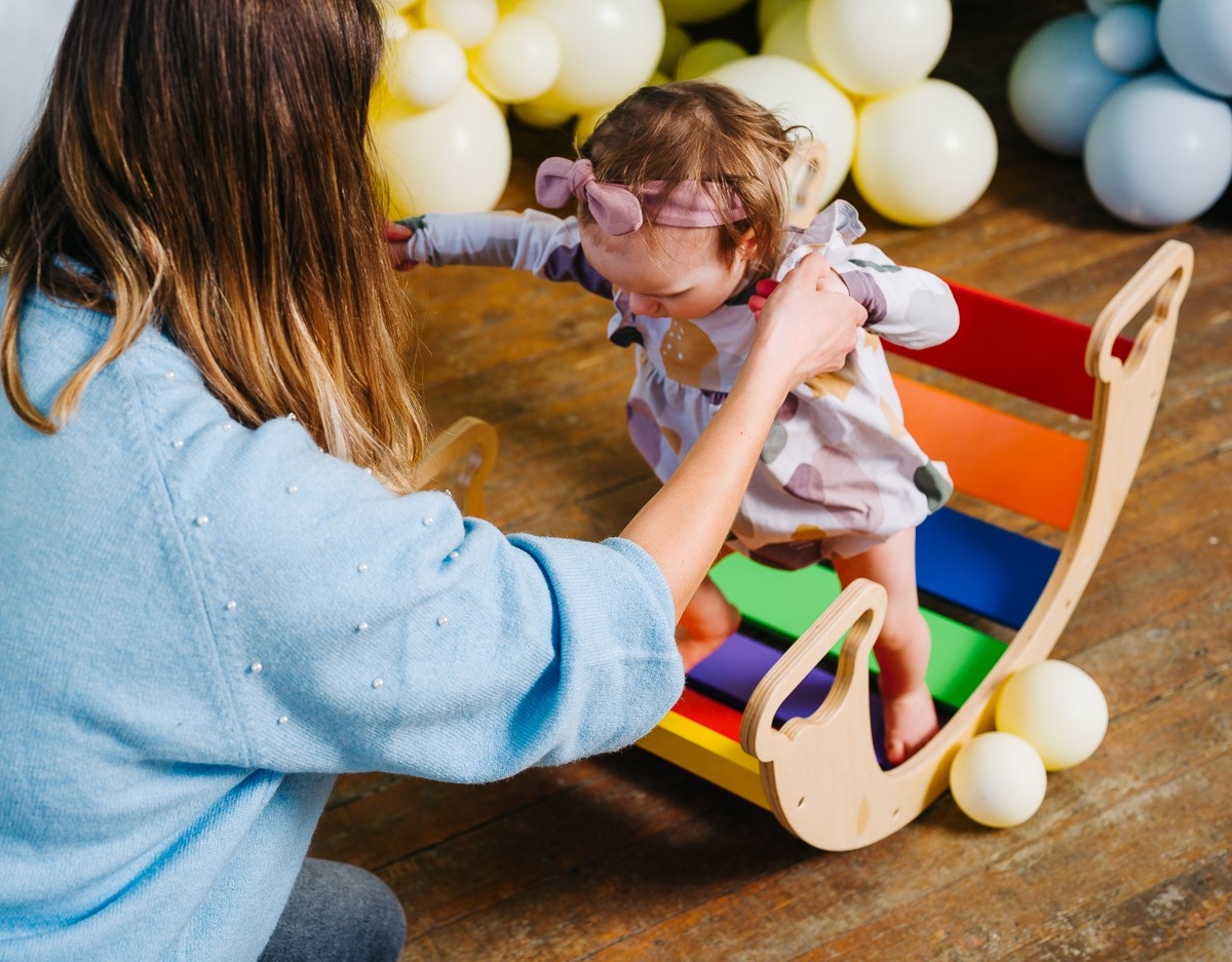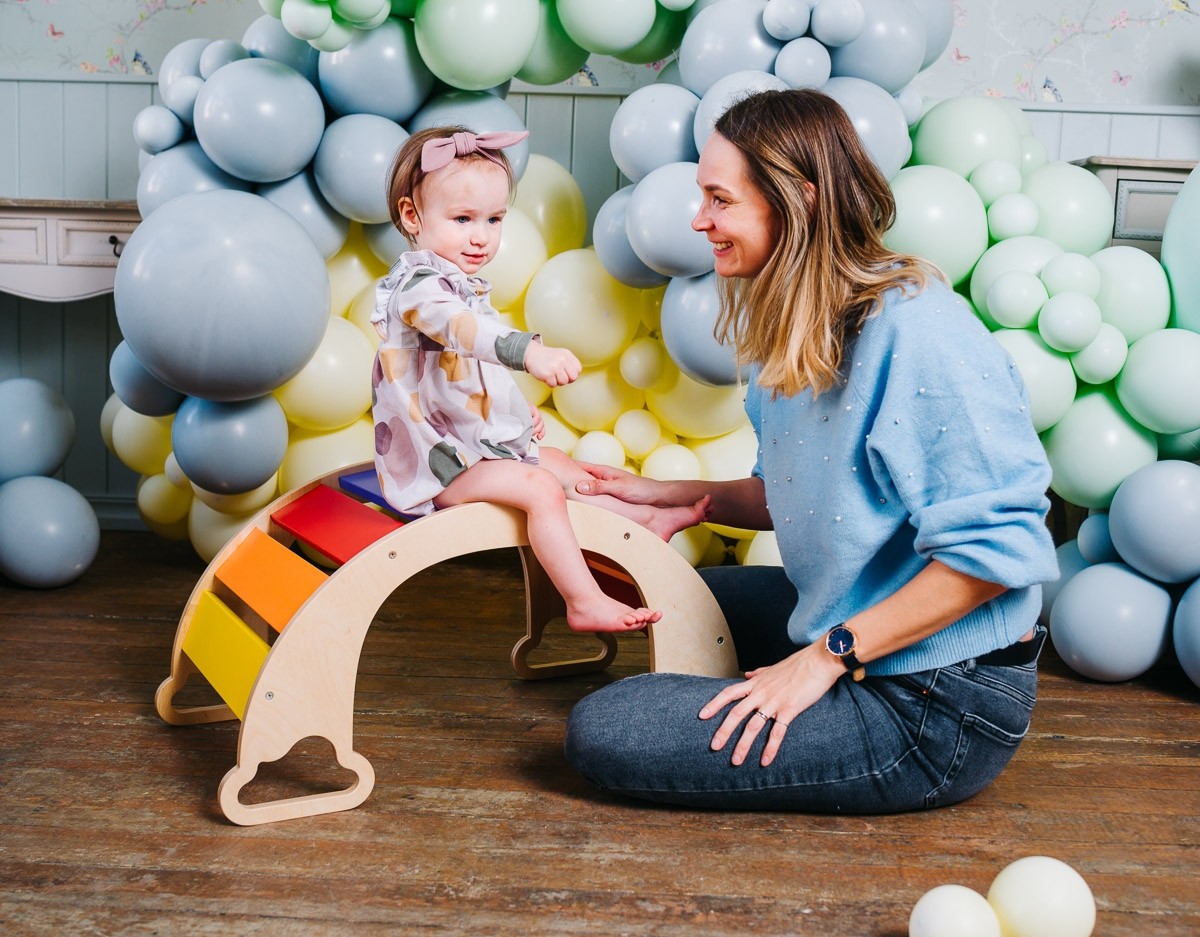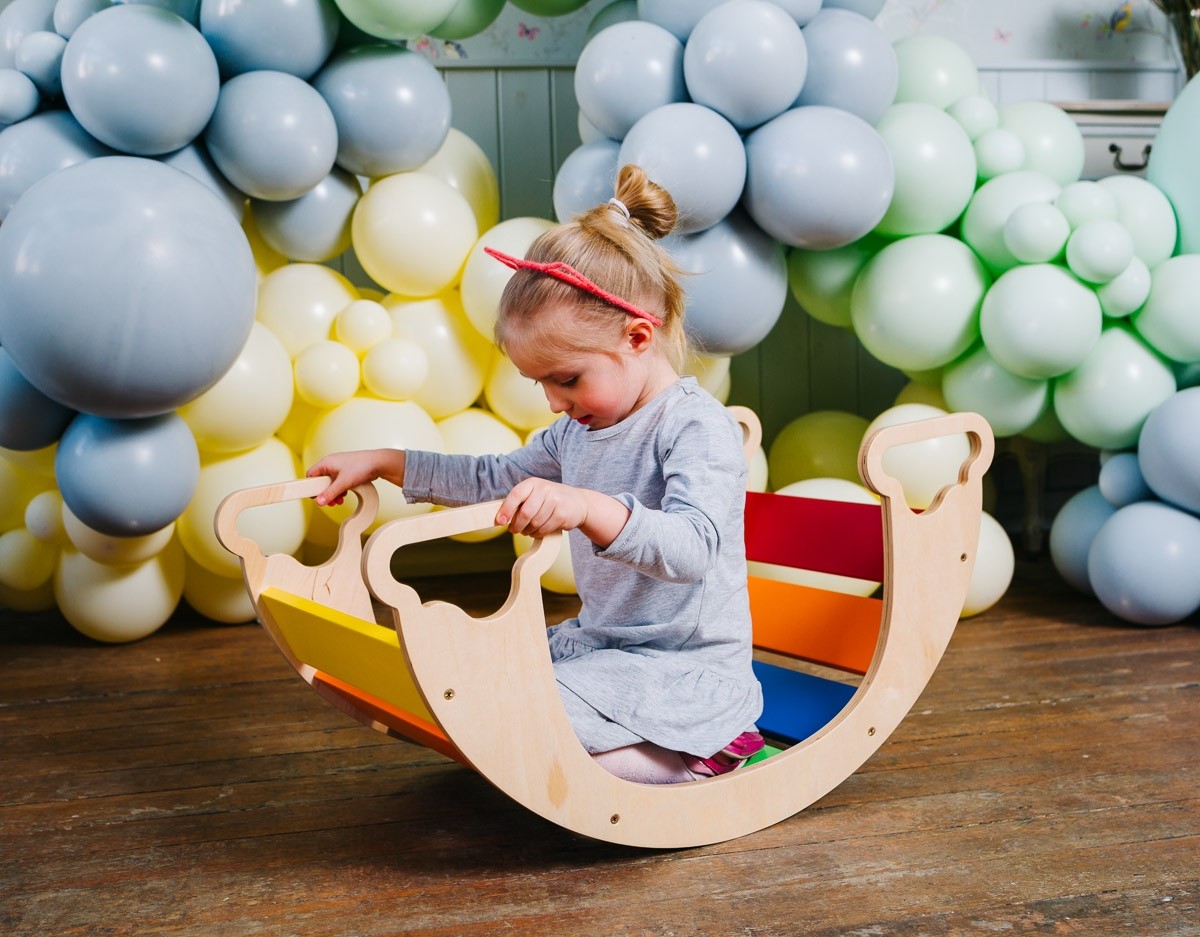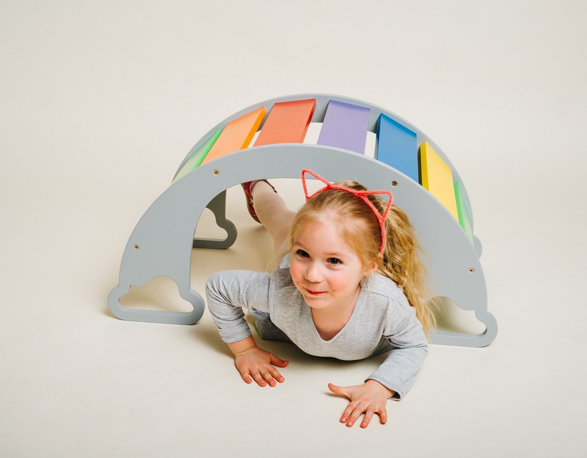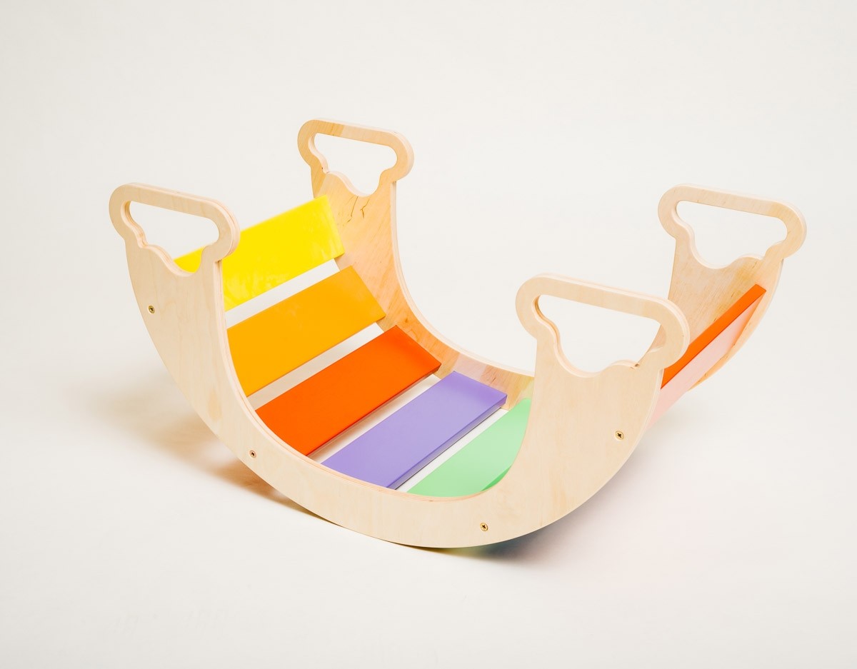 MONTESSORI GUGALNICA - MAVRICA je varna in praktična igrača za vašega malčka. Z Montessori gugalnico bo otrok lažje razvil svojo domišljijo, ter svoje motorične in kognitivne sposobnosti. Je multifunkcijska igrača, katero lahko otrok uporablja na tri različne načine: za plezanje, kot gugalnico ali kot pult za katerim se lahko otrok igra trgovino, knjižnjico, in podobno. Letvice so na voljo v živahnih barvah mavrice, za barvo ogrodja pa lahko izbirate med natur, belo in sivo barvo.