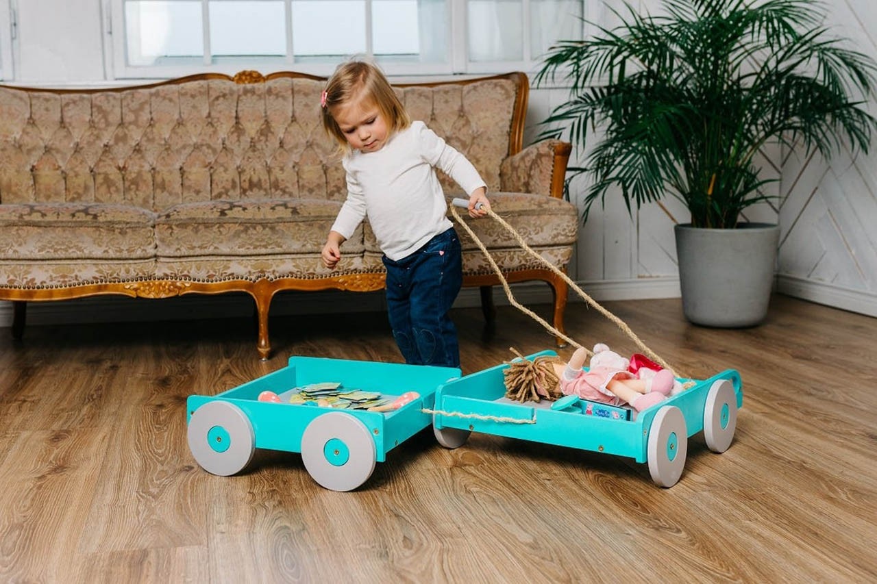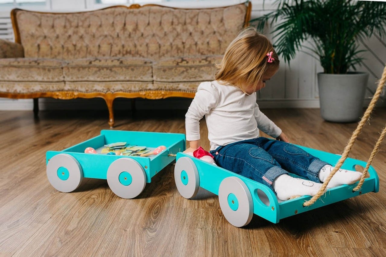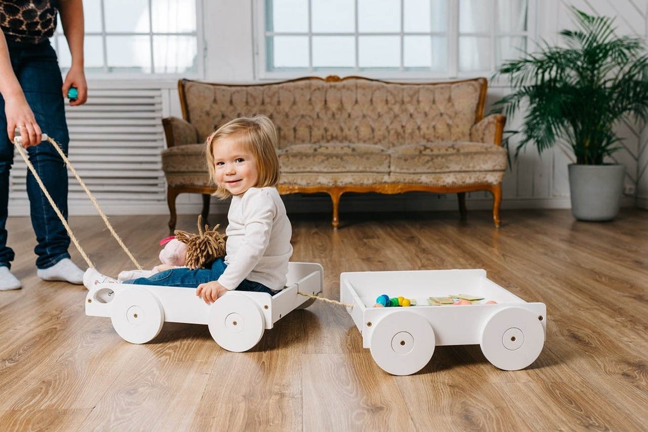 Preprost in prikupen Montessori voziček za igrače lahko otrok uporabi za shranjevanje in prevažanje igrač ter za aktivno igro z drugimi malčki. Voziček ima koleščka, zato ga lahko otrok brez težav tudi sam premika in vozi naokoli. Voziček je zelo stabilen, zato se lahko tudi otroci usedejo vanj in s pomočjo odraslih ali drugih otrok vozijo naokoli in maksimalno uživajo v varnem zavetju svojega doma.