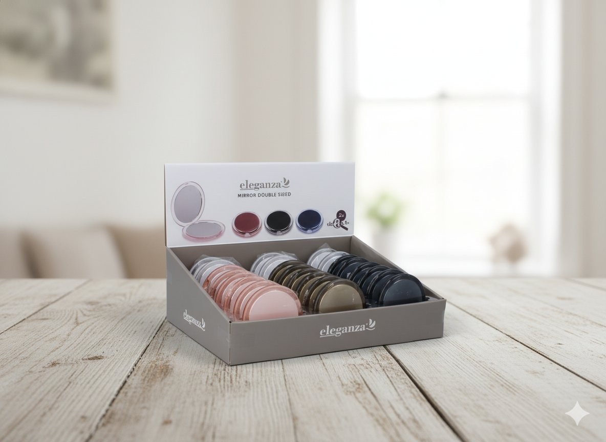 Namizno ogledalo Kruli (zložljiv) je kompaktno ogledalo za ličenje in vsakodnevno nego. Zložljiva okrogla oblika omogoča preprosto shranjevanje v torbici ali kozmetični torbici, obojestranska izvedba pa poveča uporabnost pri vsakodnevni rabi.