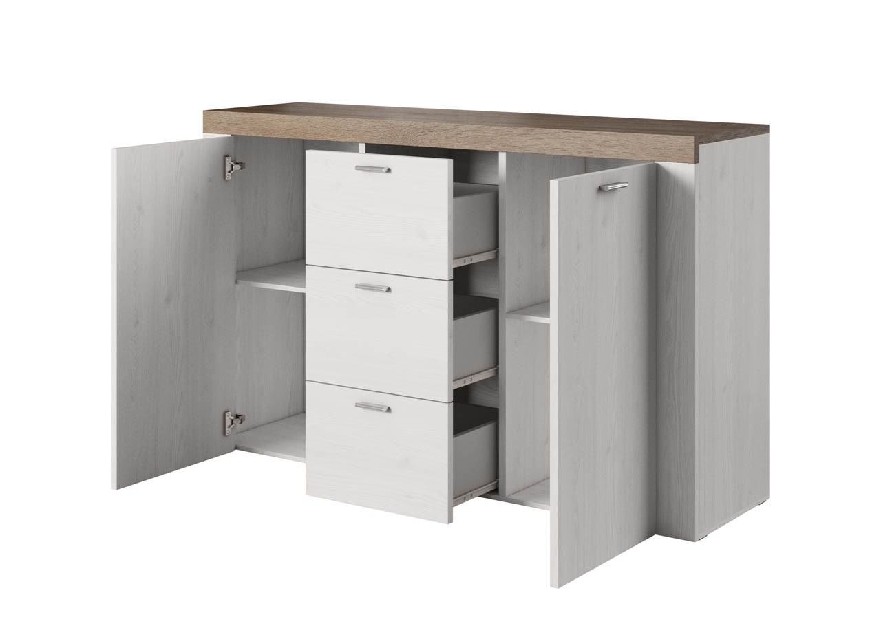 Opremite svoj dom z univerzalno komodo ERIKA, ki se zaradi minimalističnega dizajna in moderne barvne kombinacije odlično poda v vsako predsobo, dnevno sobo, jedilnico in spalnico. Komoda ima tri prostorne predale in dvojna vratca s polico, zato vam nudi obilo prostora za shranjevanje in dobro organizacijo najrazličnejših predmetov! Na voljo je tudi v drugih barvah!