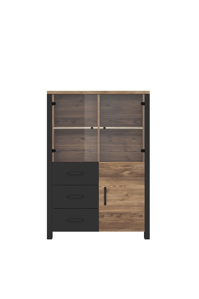 Nizka vitrina OLIN vam omogoča ogromno odlagalnega prostora za kozarce, krožnike, knjige, družabne igre in ostale stvari za katere potrebujete dodaten prostor. Vitrina je na voljo v kombinaciji smreke in črne barve, ki vam bo modernizirala prostor.