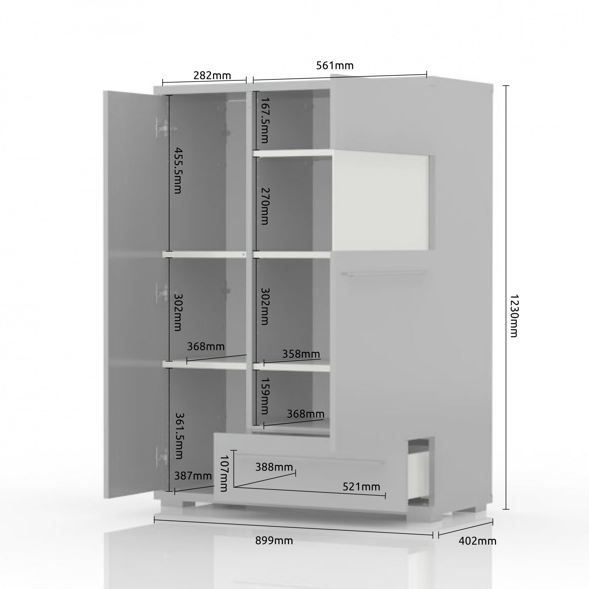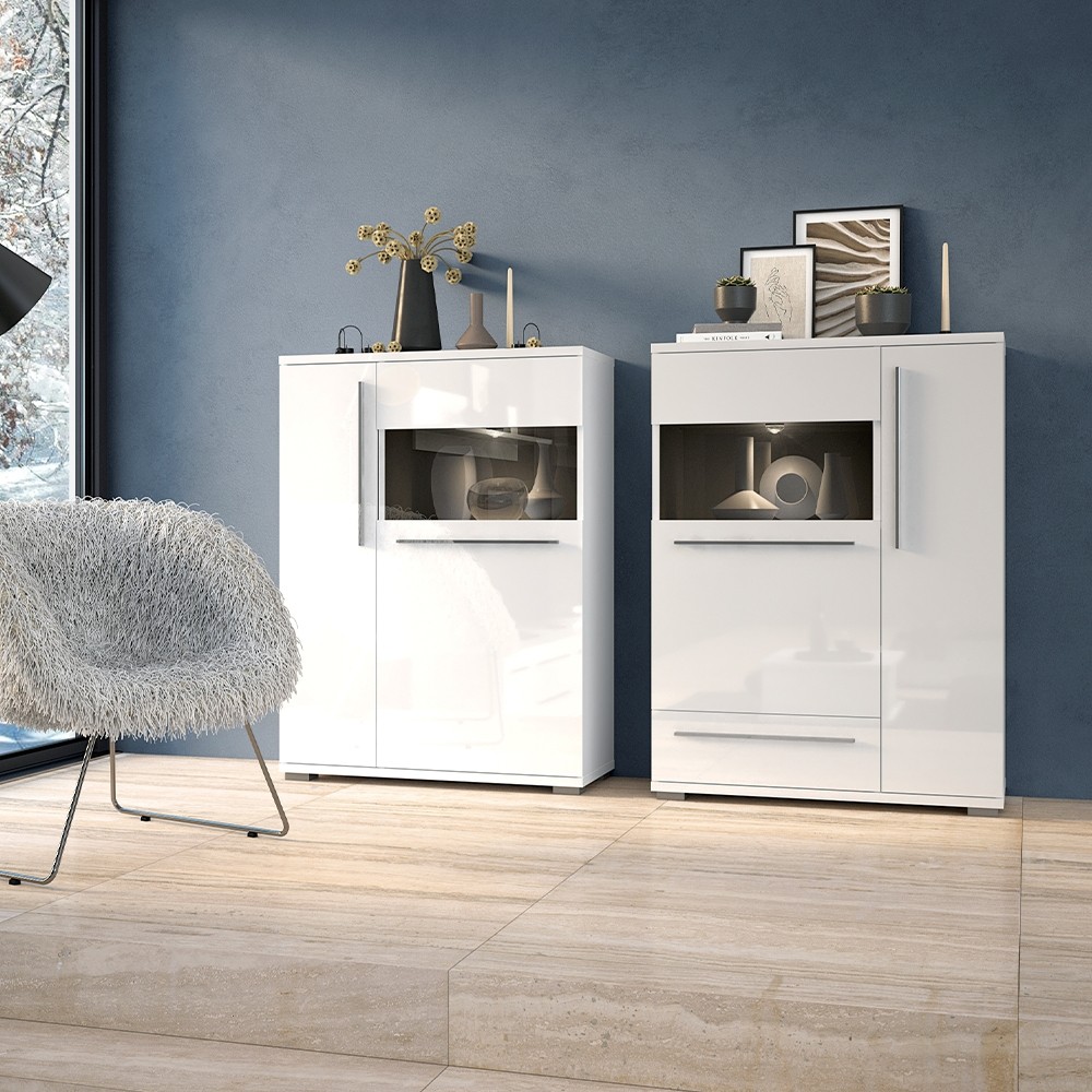 Moderna vitrina z LED osvetlitvijo, katero si lahko prilagodite svojim željam in potrebam! Vitrina Radda Piano je na voljo v beli barvi v visokem sijaju, ki bo v vaš dom prinesla kanček več svetlobe in elegance. Vključuje LED osvetlitev in soft-close mehanizem, ki nudi dolgoletno nemoteno uporabo in mehko zapiranje. Sestavljena je iz enega predala in dveh vratc, v notranjosti ima pet polic. Možnih je 6 različnih postavitev vitrine. izdelana je iz oplemenitene iverne plošče, ki je na zunanjih delih komode premazana z UV lakom. Zaradi univerzalnega in preprostega videza lahko vitrino uporabite v dnevni sobi, kuhinji, jedilnici ali na hodniku.