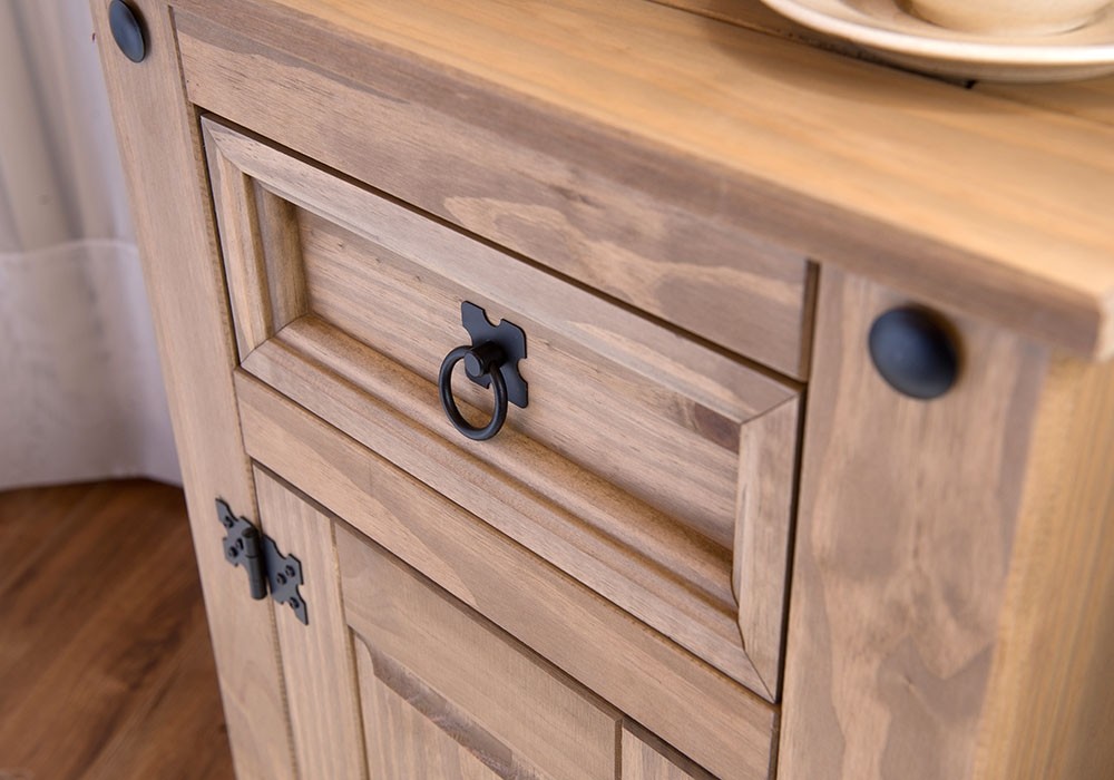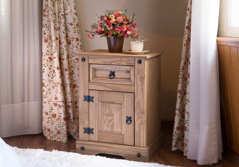 Rustikalna nočna omarica NEVADA ima profilirana vratca in kovinske detajle v črni barvi, ki skupaj ustvarita prijeten rustikalen videz. Omarica ima predal in vratca, zato lahko vanjo pospravite knjige, polnilec, in ostale poljubne izdelke, katere želite imeti vedno pri roki. Izdelana je iz masivnega borovega lesa, zato vam bo dobro služila mnogo let!