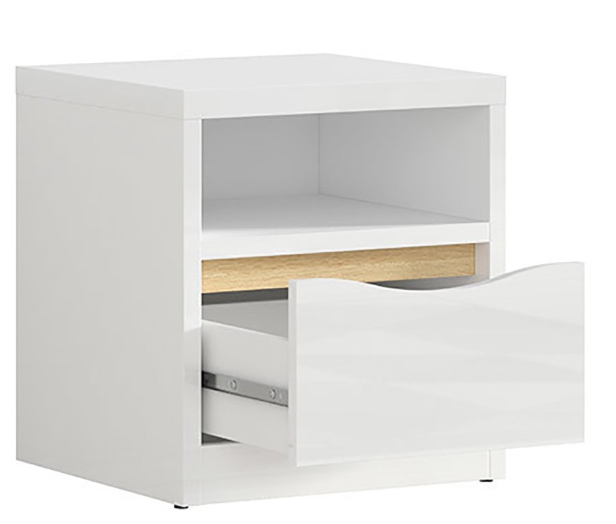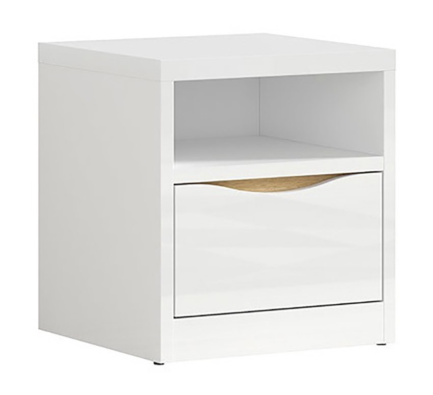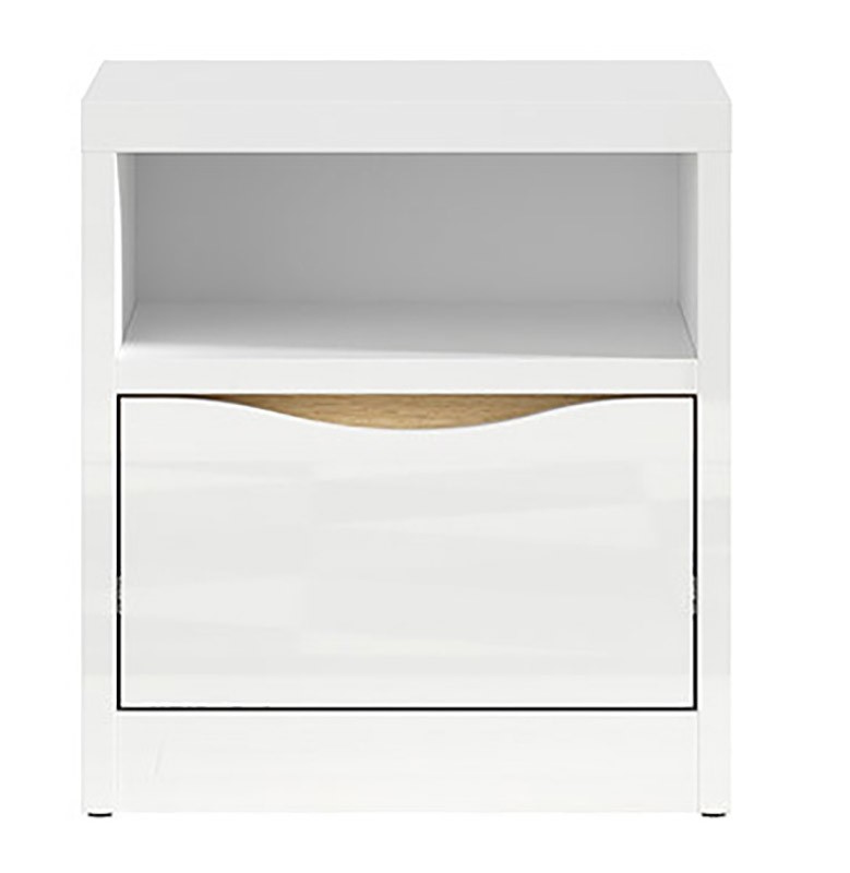 Nočna omarica PORI je preprosta, eleganta in odlična ideja za vsako spalnico. Na voljo je v elegantni beli barvi v visokem sijaju, s pridihom barve hrast. Omarica ima dovolj velik predalnik za vaše predmete, na polički je pa dovolj prostora za razne knjige in ostali bralni material. Bela barva se odlično poda z dekoracijo v živahnejših barvah in tako ustvari prelep bivalni prostor. Omarica je narejena iz kakovostnega materiala, ki je bolj odporen proti poškodbam in vlagi. Ima tudi funkcijo tihega zapiranja.