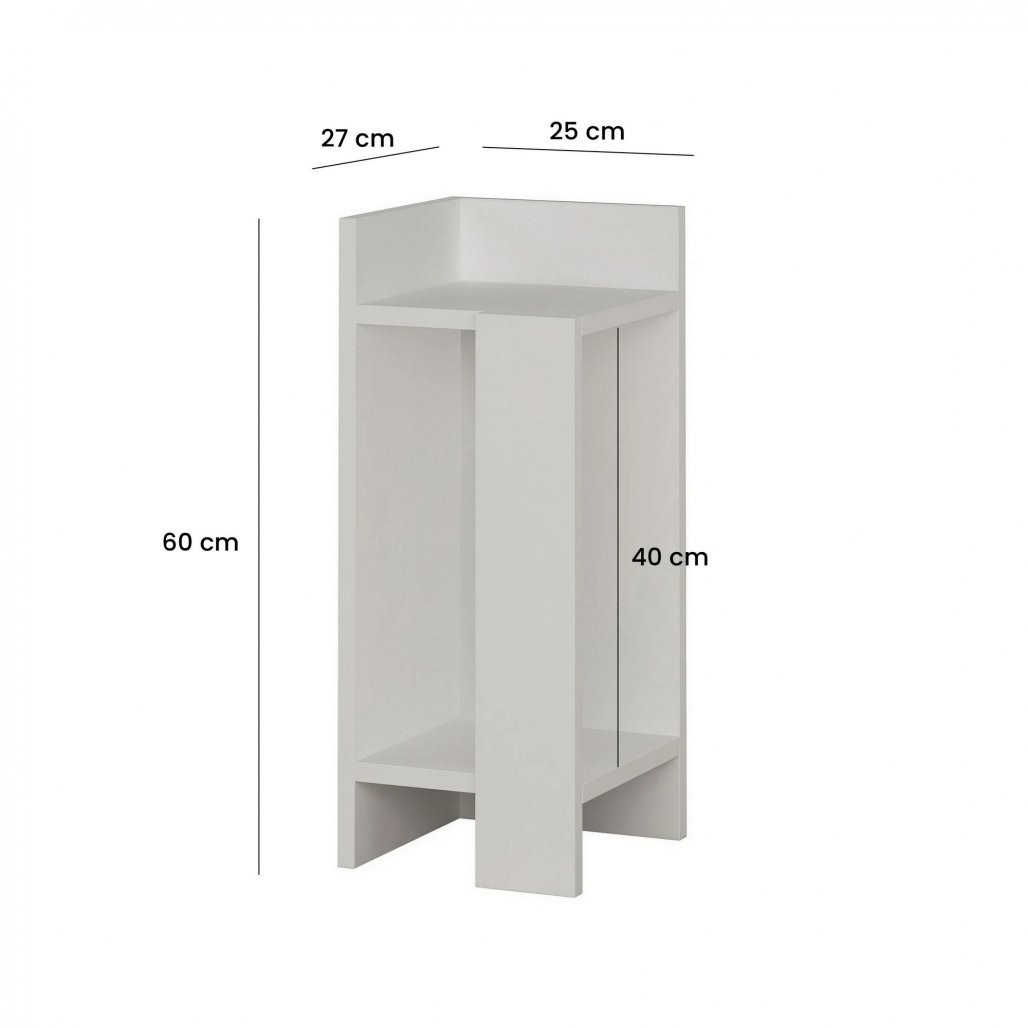 Nočna omarica je izdelana iz 100-odstotno melaminirane iverne plošče, zato se ponaša z izjemno trpežnostjo in dolgo življenjsko dobo. Njena 18 mm debelina zagotavlja trdnost in vam omogoča, da boste v njeni lepoti uživali dolga leta. Zaradi elegantne in kompaktne oblike s širino 25 cm, višino 60 cm in globino 27 cm se odlično prilega vsaki spalnici, ne glede na velikost ali slog.