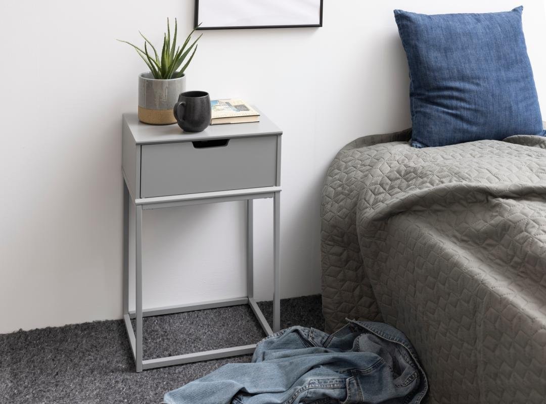 Nočna omarica Ravelo predstavlja minimalistično in funkcionalno možnost za vašo spalnico. Z enojnim predalom nudi dovolj shranjevalnega prostora, njena kompaktna velikost pa omogoča, da se prilega tudi v manjše spalnice. Kvaliteten material, kot je mediapan plošča, in kovinsko podnožje dajejo omarici sodoben izgled. Grafitna barva pa je univerzalna in se bo zlila z vsako barvo vaše spalnice.